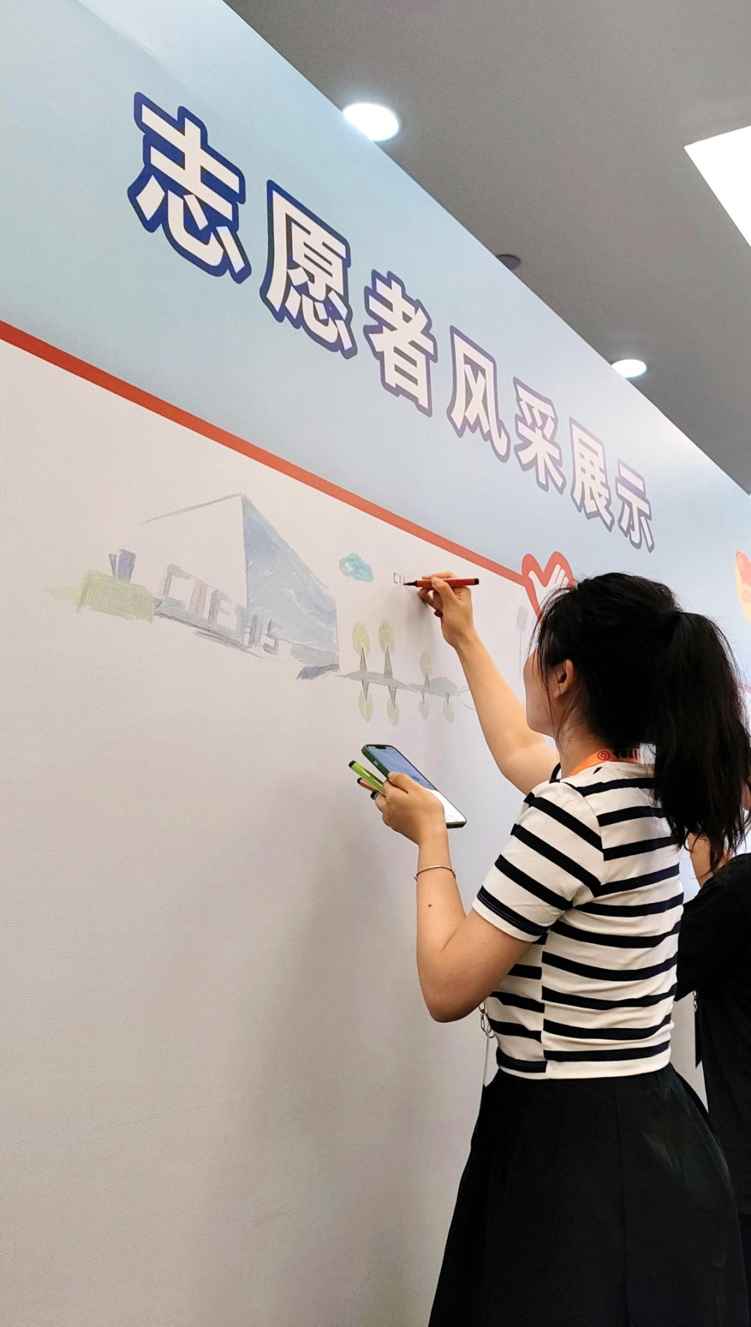 初等教育学院2020级本科生袁雪萌带领宣传队,结合专业创作展板与海报。为了突出服贸会双展区模式,她在画面主体加入首钢与国家会议中心的元素,同学们纷纷打卡留念。