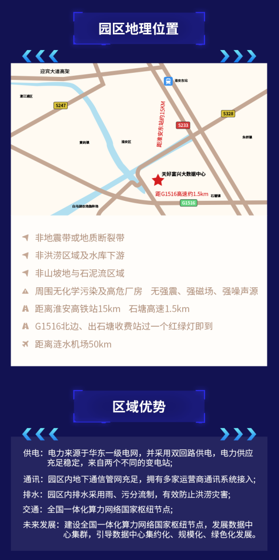 天好大数据中心位于淮安市淮安区国信工业园,距徐淮盐高速仅2KM。从园区前往淮安高铁东站车程不足半小时,数据中心采用先进的技术和设备,包括低功率机柜(20A)和高功率机柜(40A)两种类型,达到了国家A级可靠(建设)等级,可满足不同规模的业务需求。同时配备了完善的电力供应系统和安全保障措施,确保数据中心的稳定运行和信息安全。