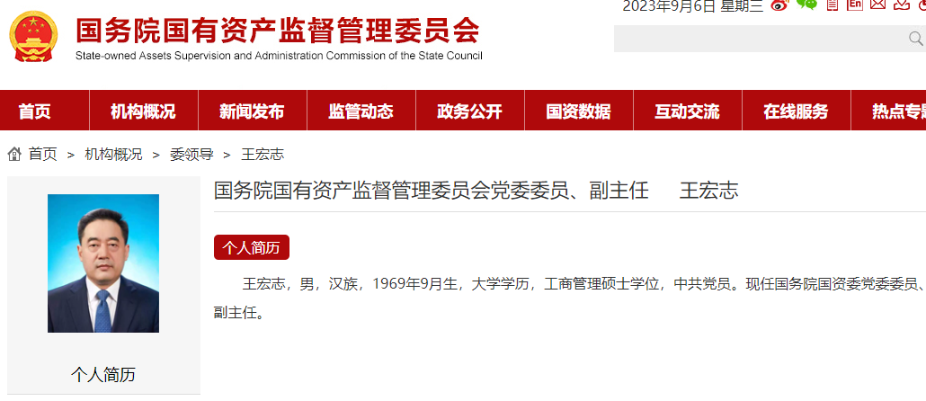 2023年9月6日,国务院任命王宏志为国务院国有资产监督管理委员会副主任。