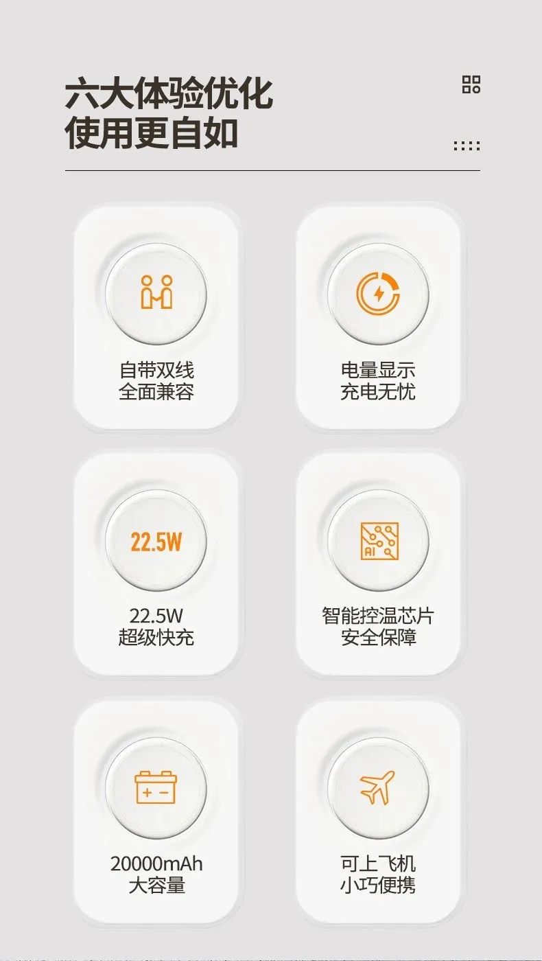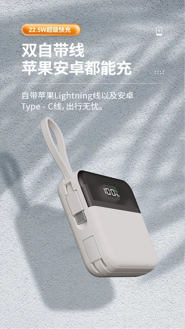 ✅10000mAh/20000mAh大容量,优质电芯 ✅自带Type-C+Lightning充电线 满足大部分安卓、苹果设备充电需求 外出无需带充电线 ✅支持华为22.5W超级快充+苹果PD20W快充 ✅多接口,4台手机同时充? ✅电量显示,智能保护 ✅小巧便携,可上飞机、高铁 ✅内搭智能芯片,锂聚合物电芯,安全防爆