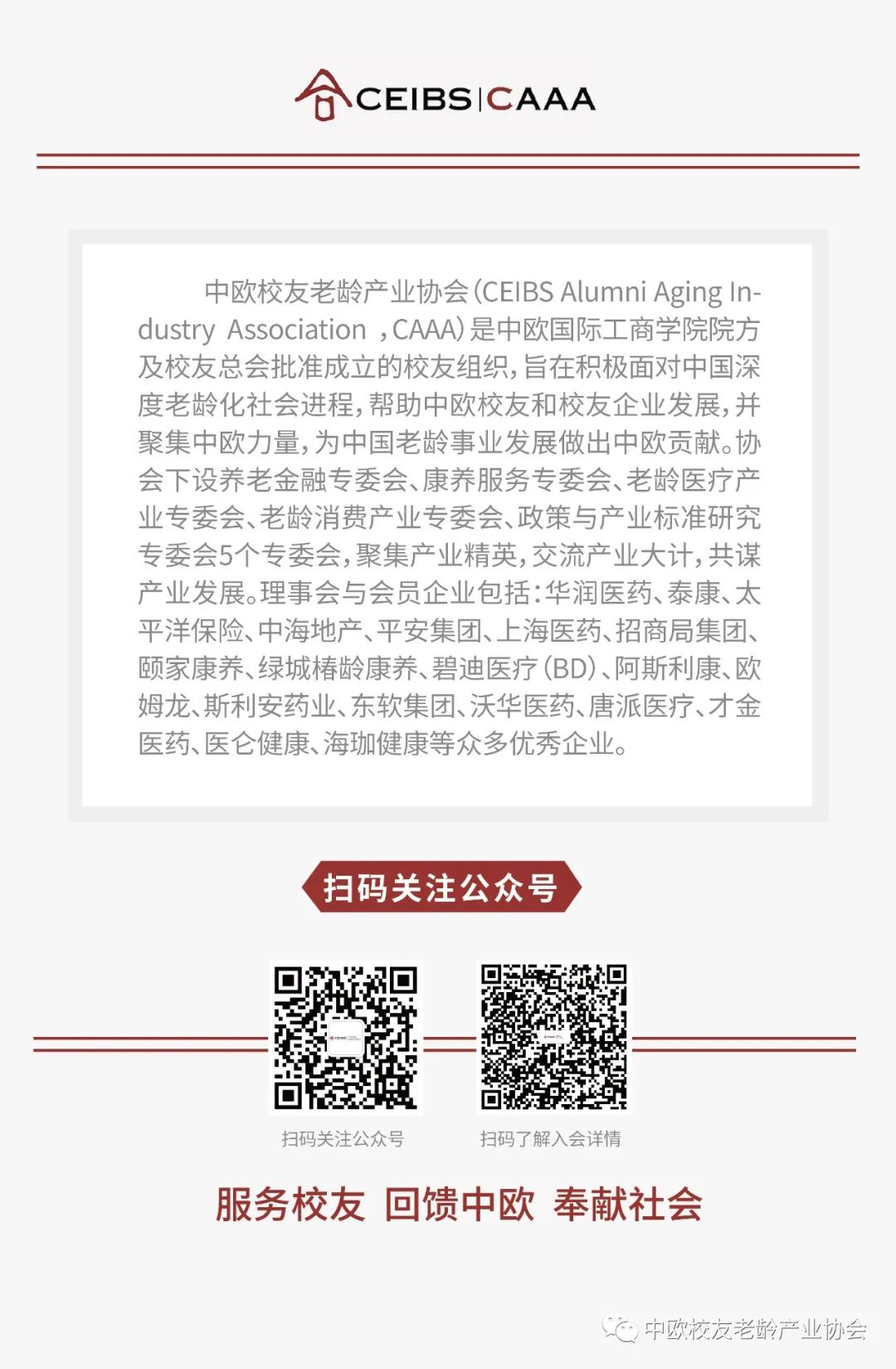 欢迎中欧校友加入我们,共同关注老龄行业动态,共同推动老龄产业的发展。让我们携手努力,为中国人的幸福生活提供更好的服务和福利,为中国老龄事业发展做出贡献。