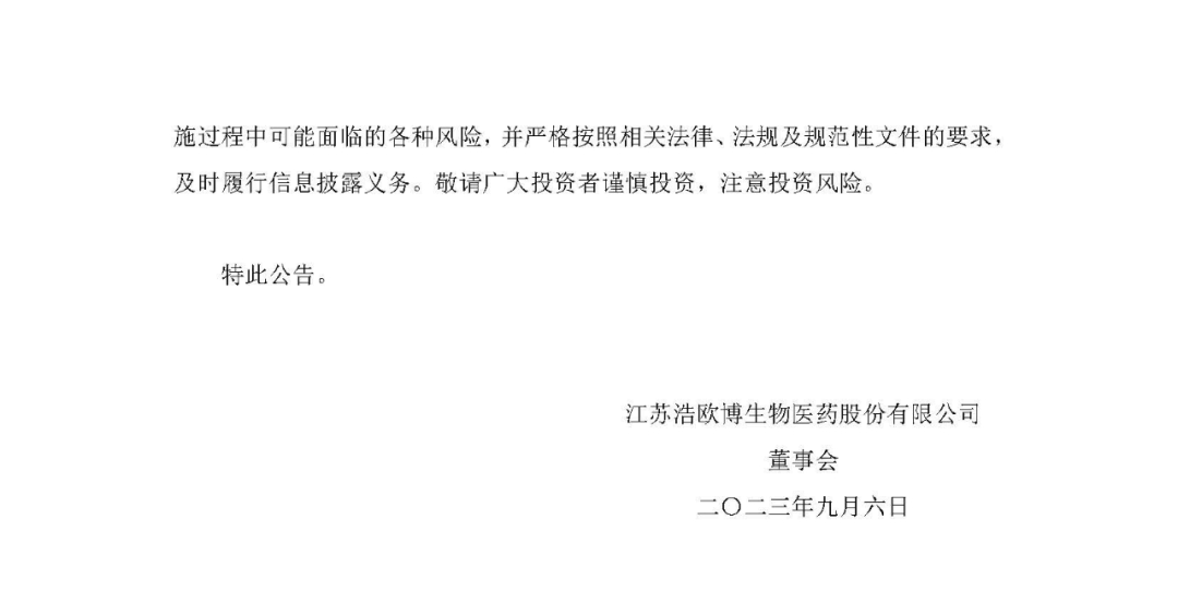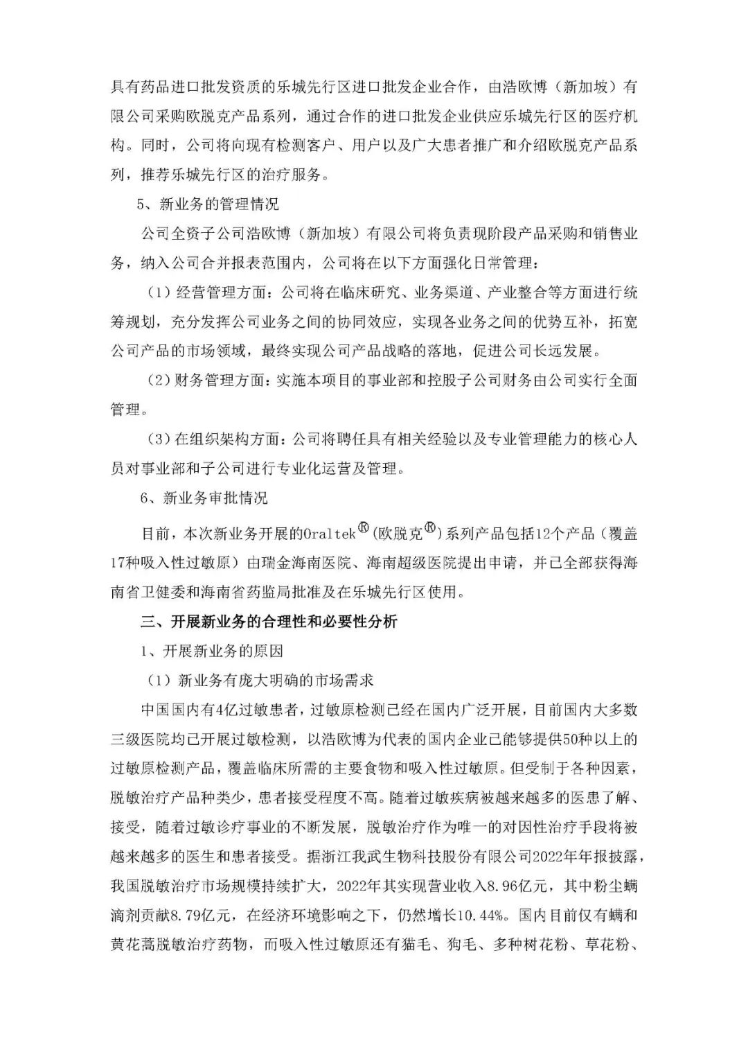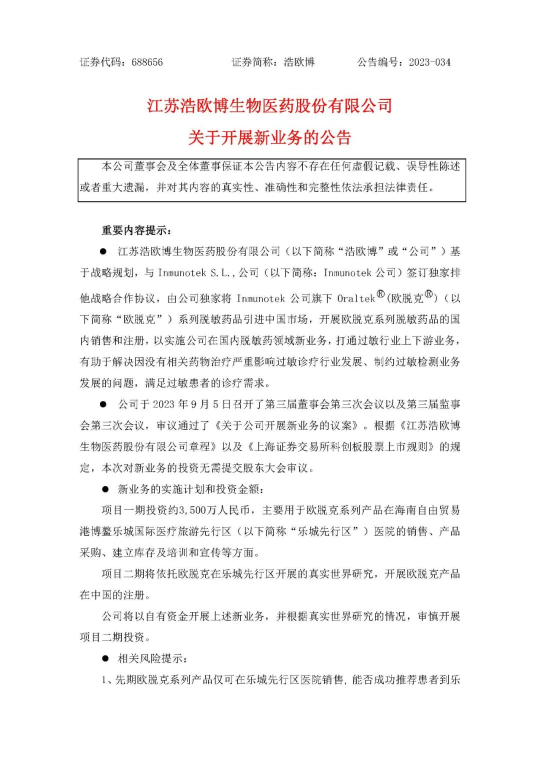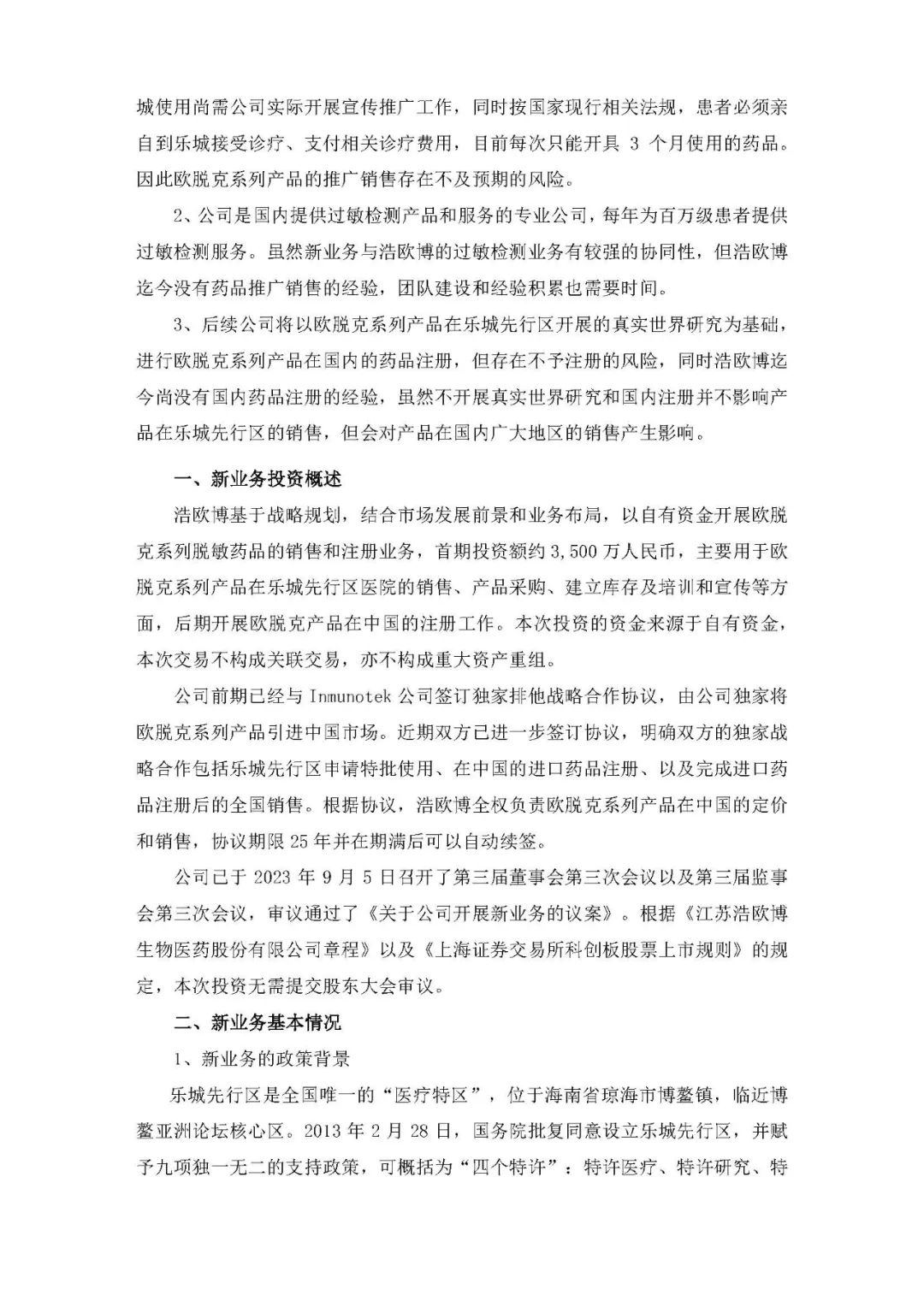 9月5日,浩欧博公布,基于战略规划,结合市场发展前景和业务布局,以自有资金开展欧脱克系列脱敏药品的销售和注册业务,首期投资额约3,500万人民币,主要用于欧脱克系列产品在乐城先行区医院的销售、产品采购、建立库存及培训和宣传等方面,后期开展欧脱克产品在中国的注册工作。本次投资的资金来源于自有资金,本次交易不构成关联交易,亦不构成重大资产重组。项目二期将依托欧脱克在乐城先行区开展的真实世界研究,开展欧脱克产品在中国的注册。