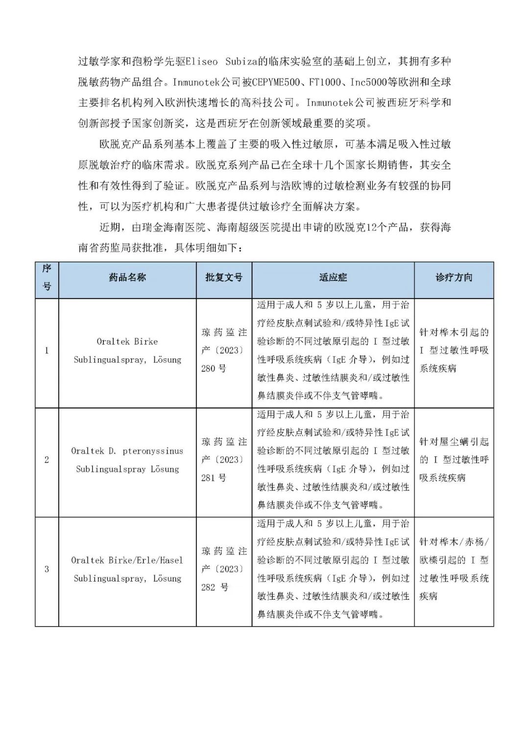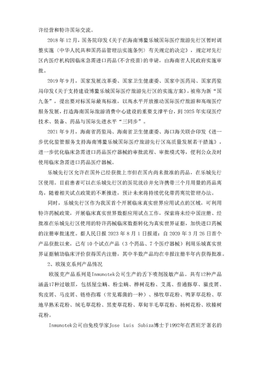 公司前期已经与Inmunotek公司签订独家排他战略合作协议,由公司独家将欧脱克系列产品引进中国市场。近期双方已进一步签订协议,明确双方的独家战略合作包括乐城先行区申请特批使用、在中国的进口药品注册、以及完成进口药品注册后的全国销售。根据协议,浩欧博全权负责欧脱克系列产品在中国的定价和销售,协议期限25年并在期满后可以自动续签。