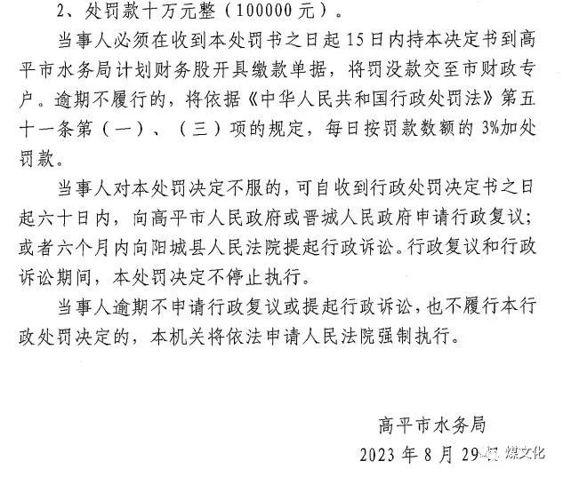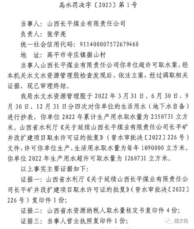 超许可取水126万立方米,山西长平煤业有限责任公司被罚款10万!