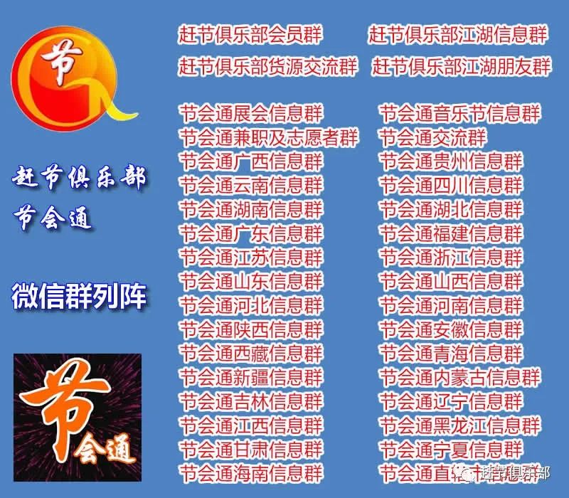在节会信息的发布方面,除【会员群】每天正常发布大量的节会信息外,我们新建的【江湖信息群】每天分享大量江湖会信息,同时也新建了【展会信息群】和【音乐节信息群】、【节会兼职及志愿者信息群】正在扩展相关领域的信息发布。