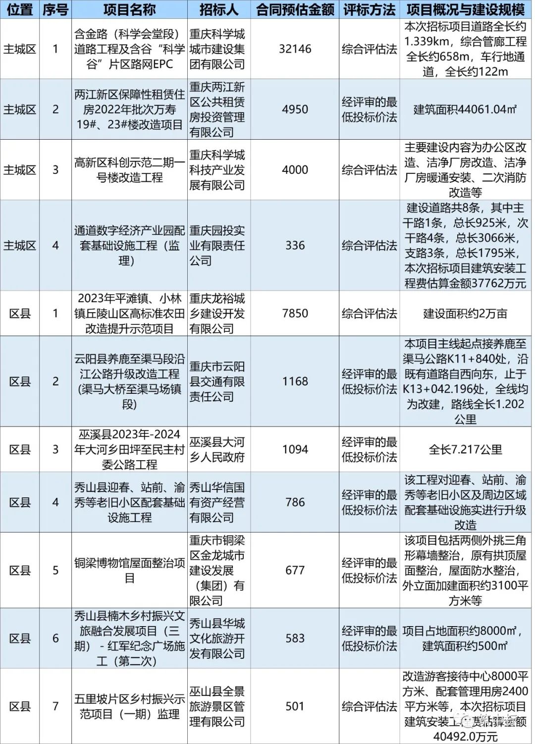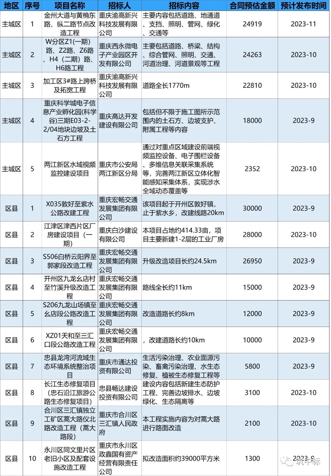 今天是2023年9月7日,下面是最新的工程建设类招标计划简讯,招标计划全市总计15条,主城区5条,周边区县10条。项目合同预估金额大于1亿的有10个,主城区4个,区县6个。1000万-1亿的有5个,主城区1个,区县4个。下面是最新的工程建设类招标公告简讯,招标公告信息全市总计11条,主城区4条,周边区县7条。项目合同预估金额大于1亿的有1个,主城区1个,区县0个。1000万-1亿的有5个,主城区2个,区县3个。其中采用“综合评估法”的项目有5个,采用“经评审的最低价投标法”的项目有6个。下面是最新的工程建设类中标候选人公示简讯,中标候选人公示信息全市总计11条,主城区5条,周边区县6条。