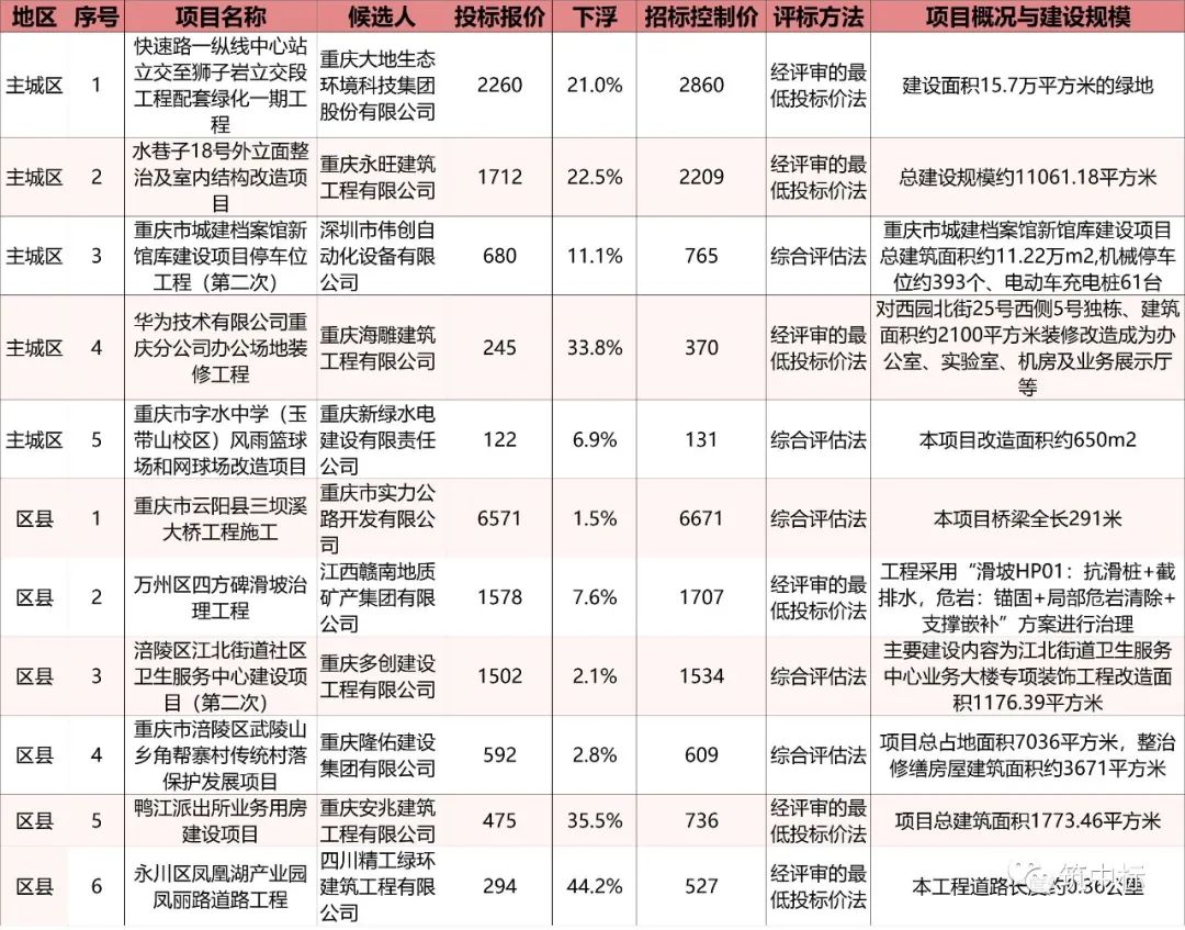 其中采用“综合评估法”的项目有5个,采用“经评审的最低价投标法”的项目有6个。项目中标价下浮率超过15%的项目有5个,最高下浮率为44.2%。