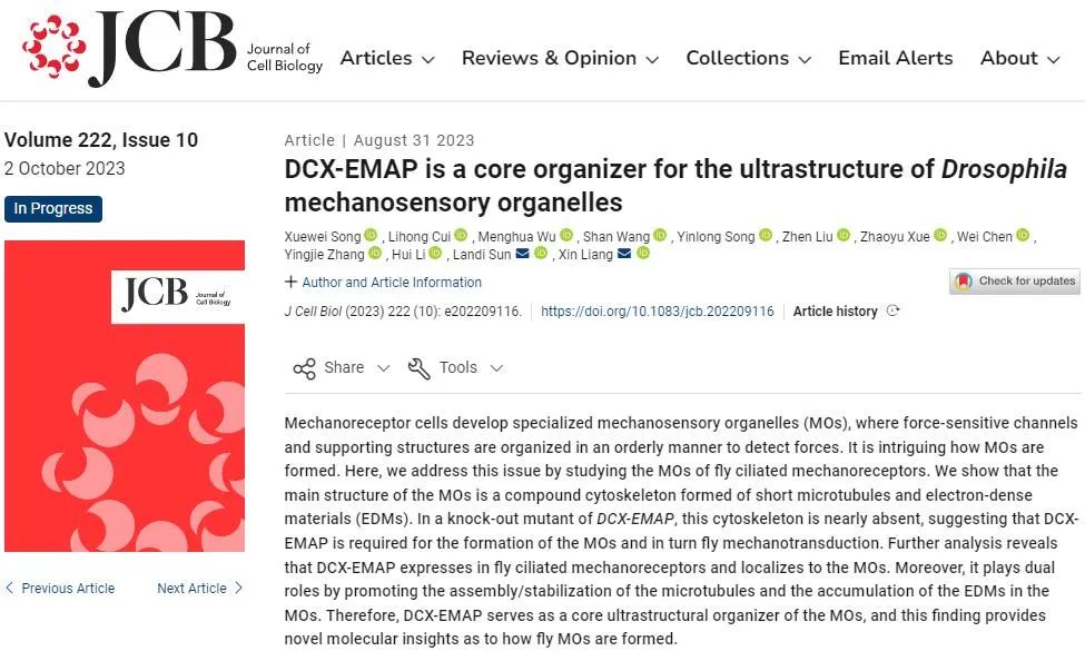2023年8月31日,清华大学生命科学学院、清华-IDG/麦戈文脑科学研究中心梁鑫课题组在 Journal of Cell Biology 期刊在线发表了题为“DCX-EMAP is A Core Organizer for the Ultrastructure of Drosophila Mechanosensory Organelles”的研究论文。