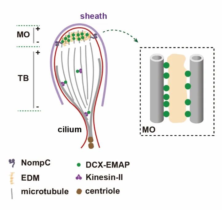 图2. DCX-EMAP 参与力感受器结构组织的分子机制