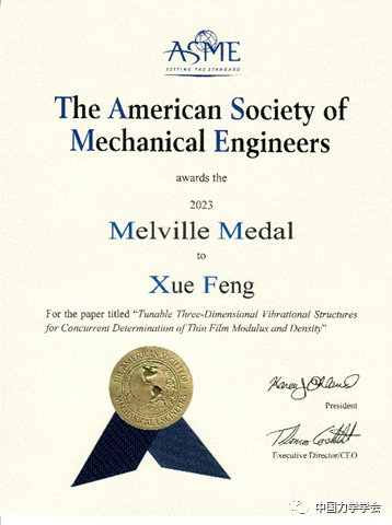 冯雪教授长期从事固体力学与柔性电子技术研究,本次梅尔维尔奖章获奖论文题为“同时测定薄膜模量和密度的三维可重构振动结构”(Tunable three-dimensional vibrational structures for concurrent determination of thin film modulus and density),2022年发表于《应用力学杂志》(Journal of Applied Mechanics)。该论文利用柔性器件的形态可重构特性,提出了一种通过振动信号同时测定薄膜材料多个力学性能的方法,对于柔性集成器件关键功能材料性能表征具有重要意义,在生物力学、流体力学、生物医学工程中也具有应用前景。