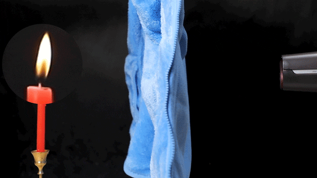 用衣服挡着吹风机吹来的风时,蜡烛可以一丝不动,撤掉衣服,蜡烛马上就被熄灭了。