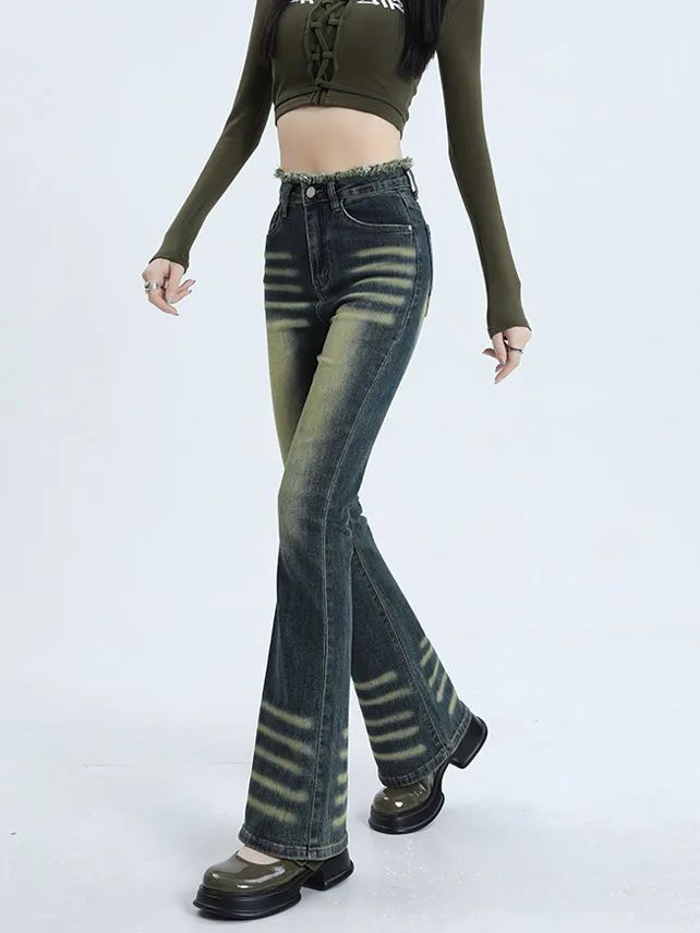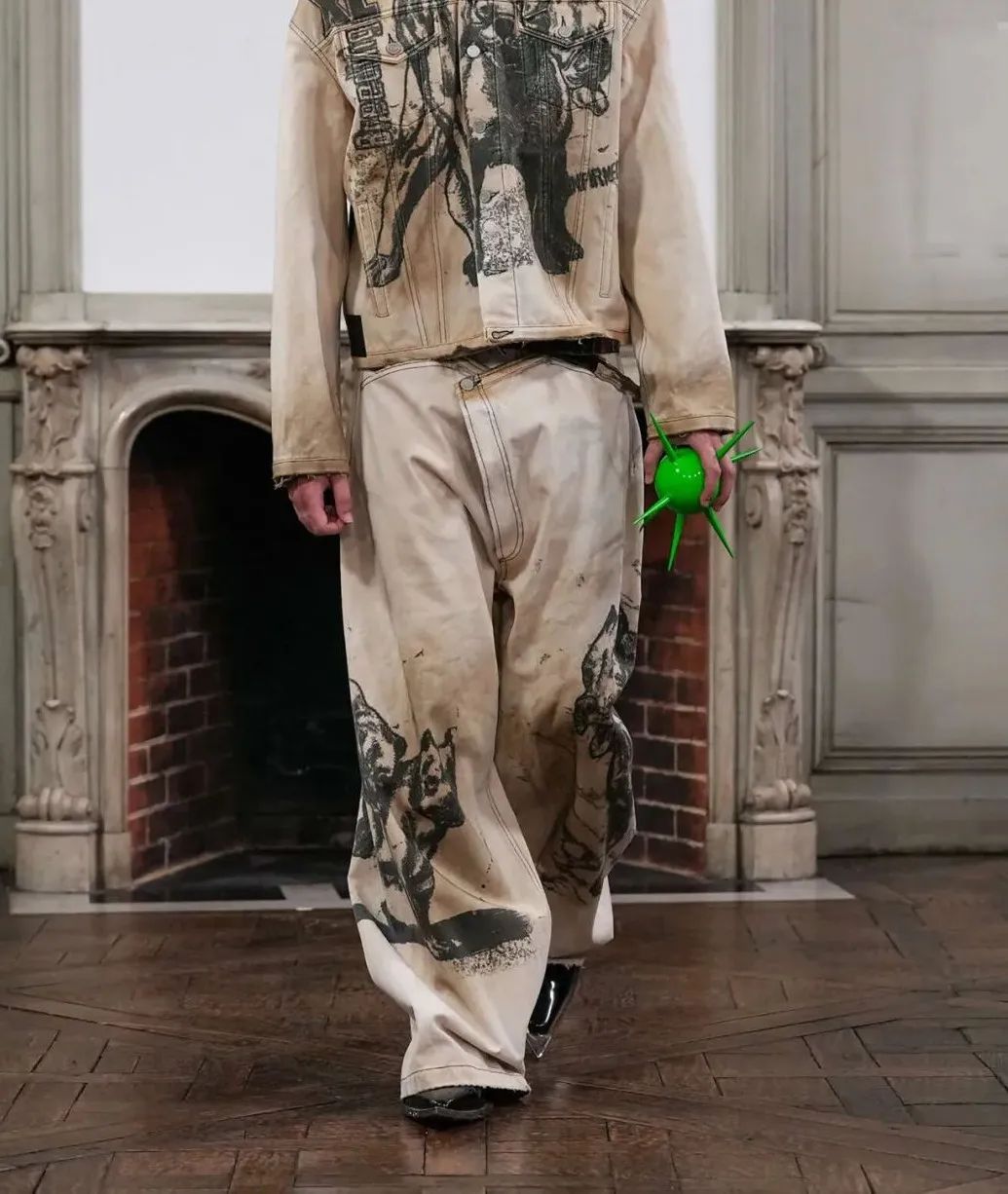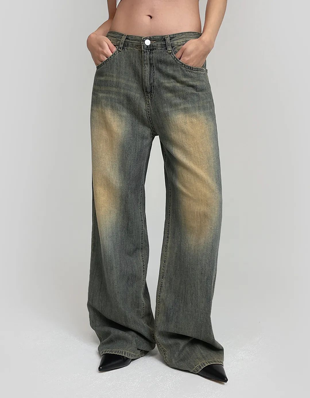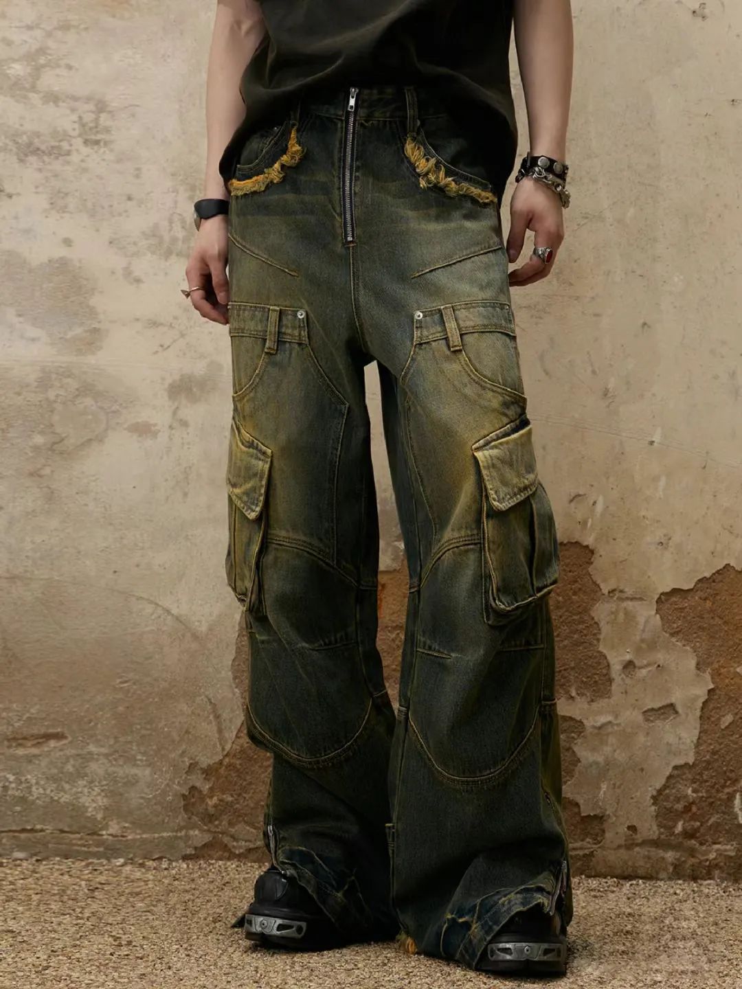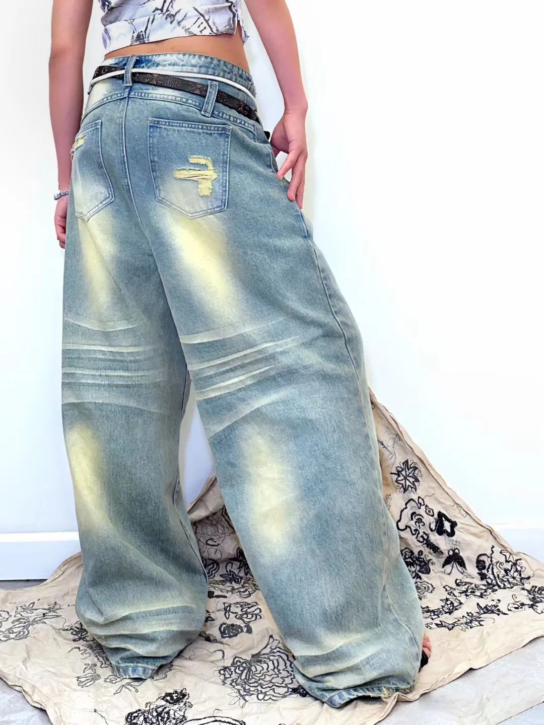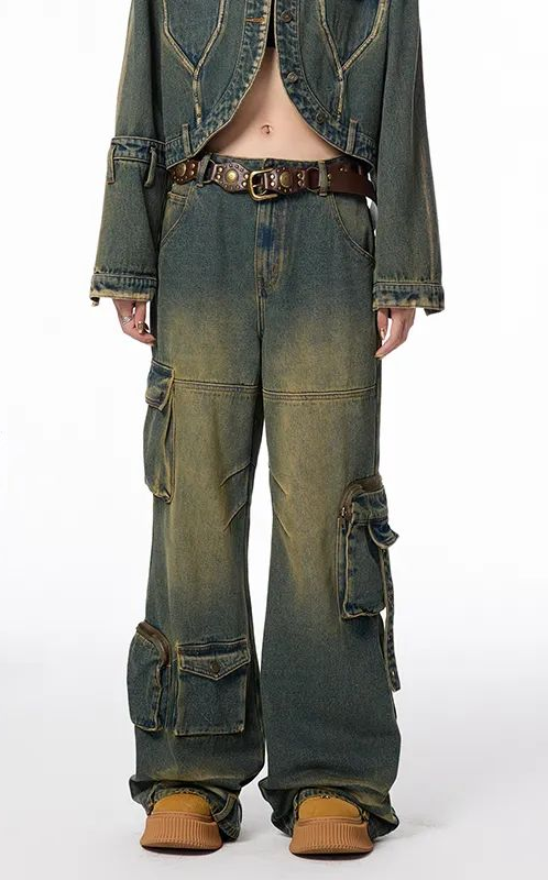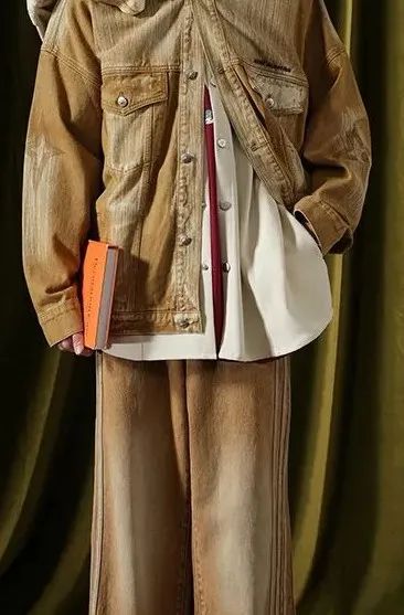 设计亮点:黄泥是一种天然土壤中含有的黄色颜料,通过与牛仔服装的接触和浸染,可以形成独特的纹理和深浅不一的黄绿色层次,使得牛仔服装呈现出自然、原始的色彩效果。黄泥的纹理和颗粒感在服装的表面形成一种复古发黄的肌理效果,增加服装的质感和层次感。同时,黄泥浸染工艺也可以使牛仔面料变得柔软舒适,更贴合身体。