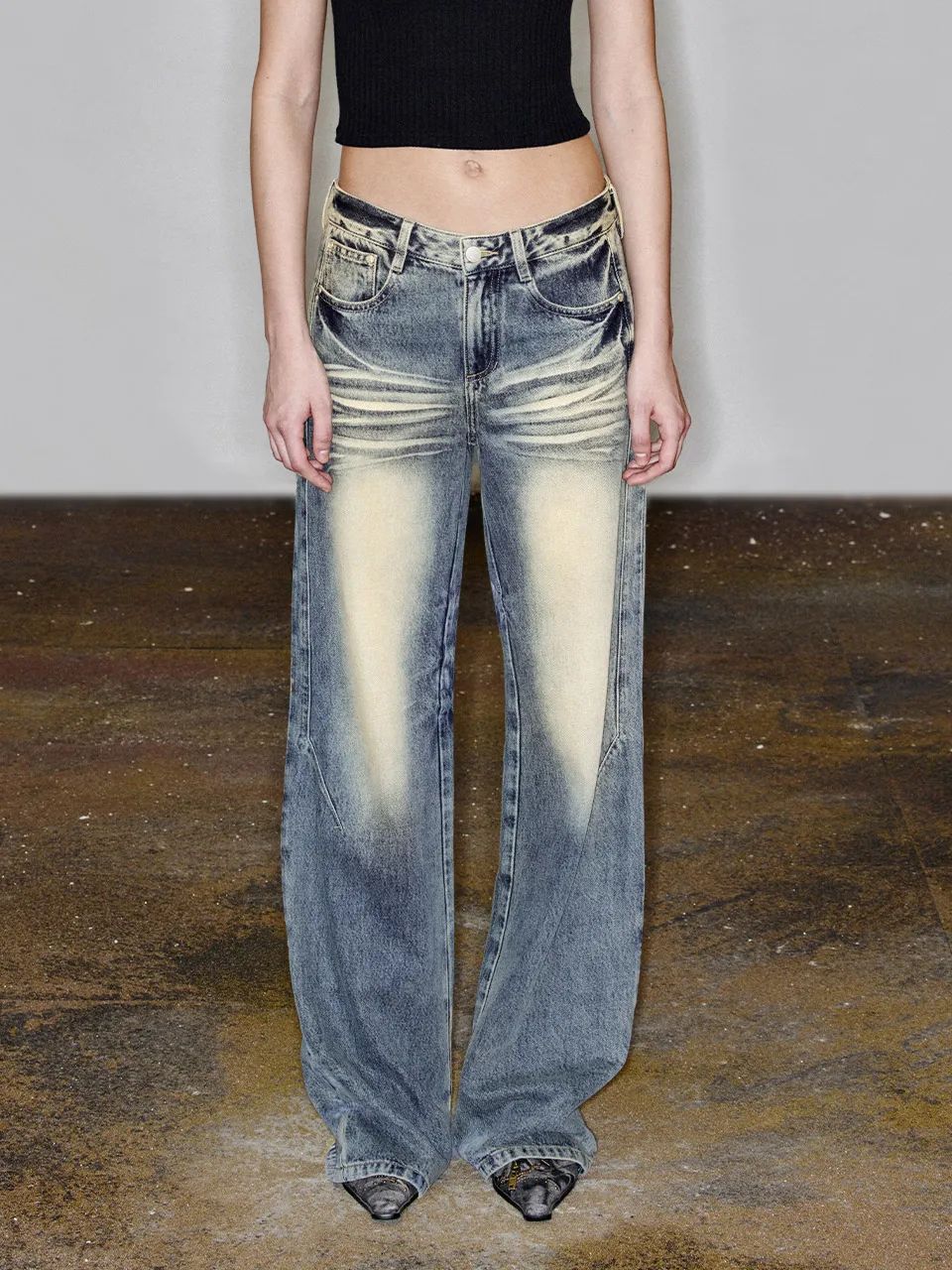 设计亮点:猫须指牛仔面料通过水洗和摩擦产生的细微织物纤维的起伏和纹路,形成一种丝状的纤维质感,对牛仔织物进行手工的水洗和摩擦,使牛仔服装表面创造出类似于天然磨损而形成的纹理,增加服装的层次感和独特性。通常在牛仔裤、牛仔夹克、牛仔衬衫等单品的服装局部细节上或活动关节处应用。