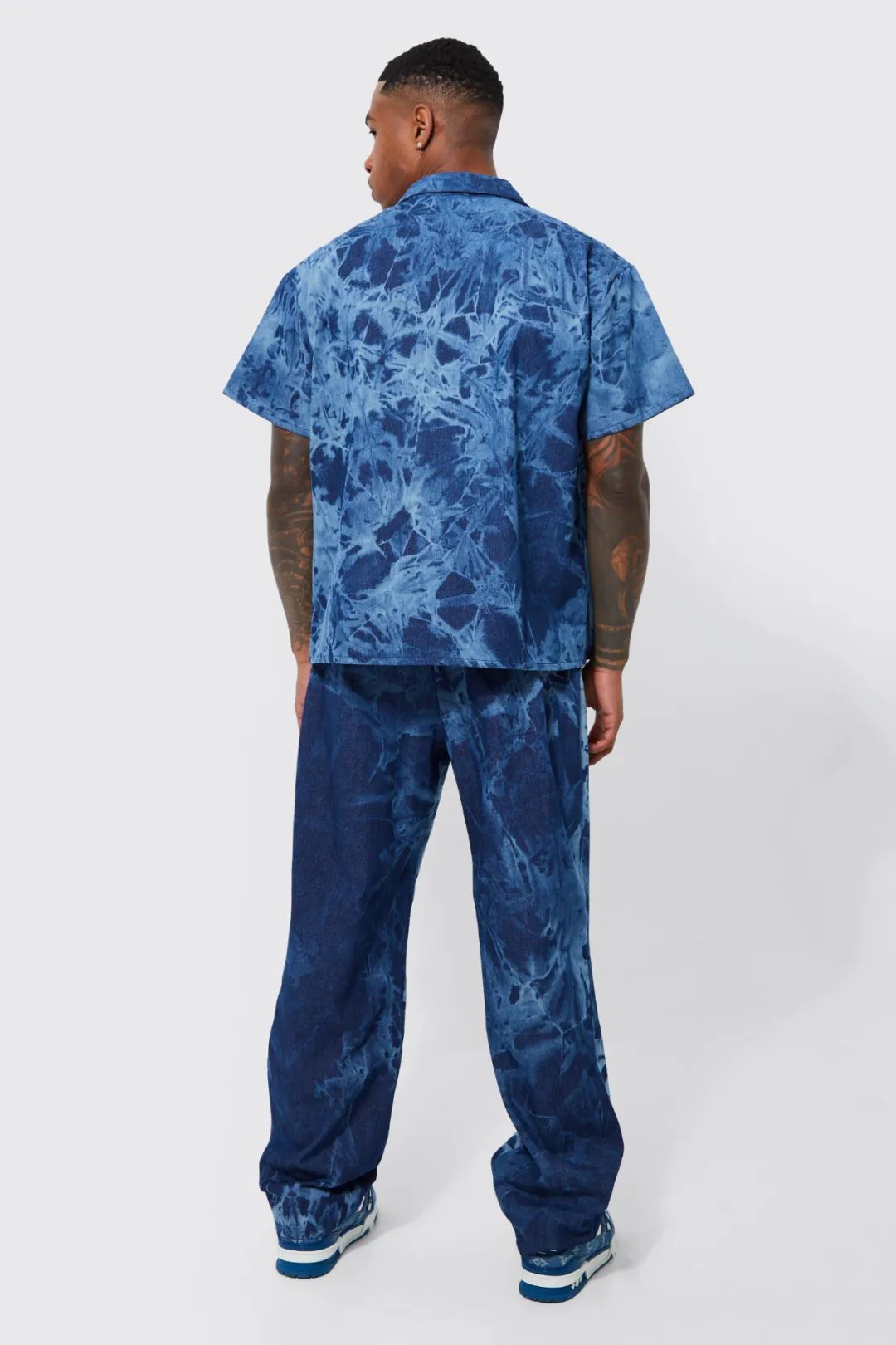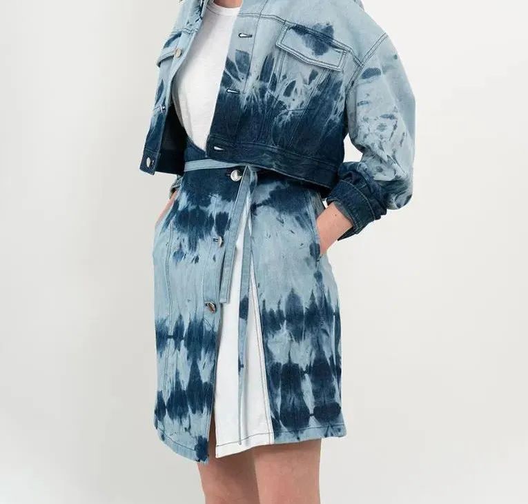 设计亮点:通过在牛仔面料上应用扎染漂色工艺,通过将染料分散在不同的部位,并采用特殊的染色技巧,使得牛仔服装呈现出多彩的效果。可以使用单色、双色、多色等方式进行扎染,增加了服装的艺术感和视觉冲击力。扎染漂色工艺可以创造出明暗对比鲜明的效果,如浅色与深色的交替、互补色的搭配等,使服装在整体上更加有层次感和立体感。