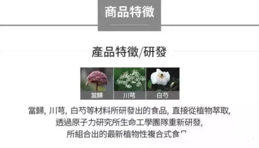 当归:再生骨髓、造血、双向调节血压、增强冠状动脉血流量、护肝、促进子宫发育、促进血液循环、补血、预防衰老、再生皮肤、增强皮肤弹性、镇定。 川芎:促进血液循环、行气去风邪、止痛、除口气、镇定、镇痛、强精、头痛、贫血、妇科病、防脱发、去除青春痘;抗溃疡、防止疤痕生成、美白皮肤、使肌肤光滑有弹性。 白芍:止痛、止汗、去肝炎、利小便、入肝经、脾经、肺经、可消除胃痉挛、神经痛、风湿性关节炎、痛经、胸痛、头痛、神经衰弱、子宫出血过多、出虚汗、盗汗。