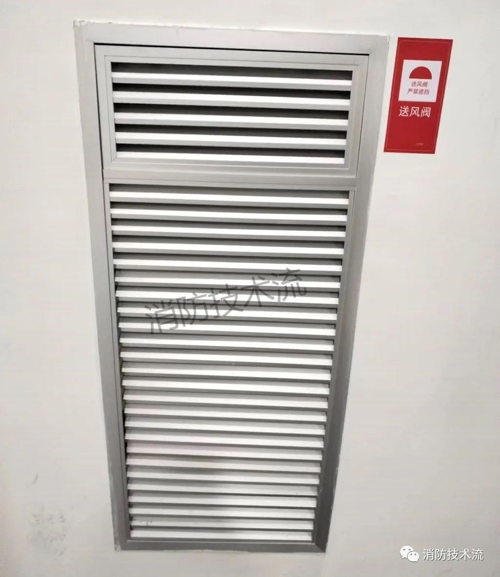 d、送风阀:通常安装于防烟楼梯前室,平时呈关闭状态并满足漏风量要求,火灾或需要辅助加压系统送风时手动和电动打开,起加压送风作用的送风设备。常闭式送风阀加装装饰性材料或配件,也可称为常闭式送风口。