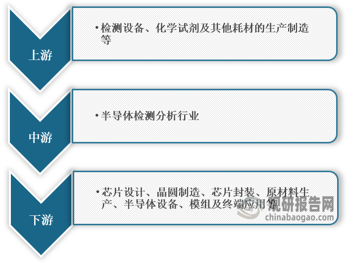 根据观研报告网发布的《中国半导体检测分析行业发展趋势分析与投资前景研究报告(2023-2030年)》显示,从产业链结构来看,半导体检测分析行业上游主要是提供检测设备、化学试剂及其他耗材的生产制造等,下游则是芯片设计、晶圆制造、芯片封装、原材料生产、半导体设备、模组及终端应用等。