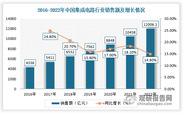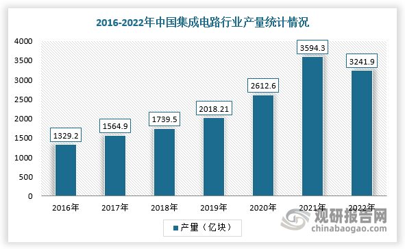 随着5G建设持续深入带动物联网、智能汽车等产业的发展,进而驱动集成电路市场需求持续增长。根据中国半导体行业协会数据显示,2021年,中国集成电路行业销售额为12006.1亿元,同比增长14.8%,创下历史新高。其中,设计业销售额为5156.2亿元,同比增长14.1%;制造业销售额为3854.8亿元,同比增长21.4%;封装测试业销售额2995.1亿元,同比增长8.4%。根据国家统计局统计数据,国内集成电路产量已从2012年的779.61亿块增长到2021年的3241.9亿块。