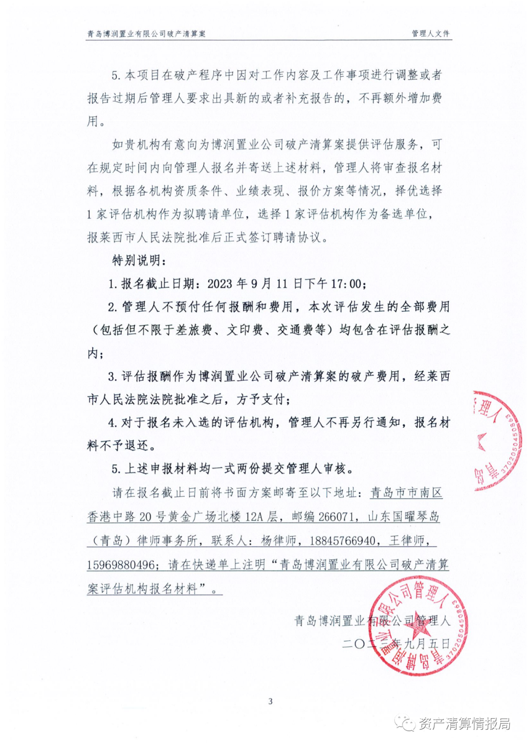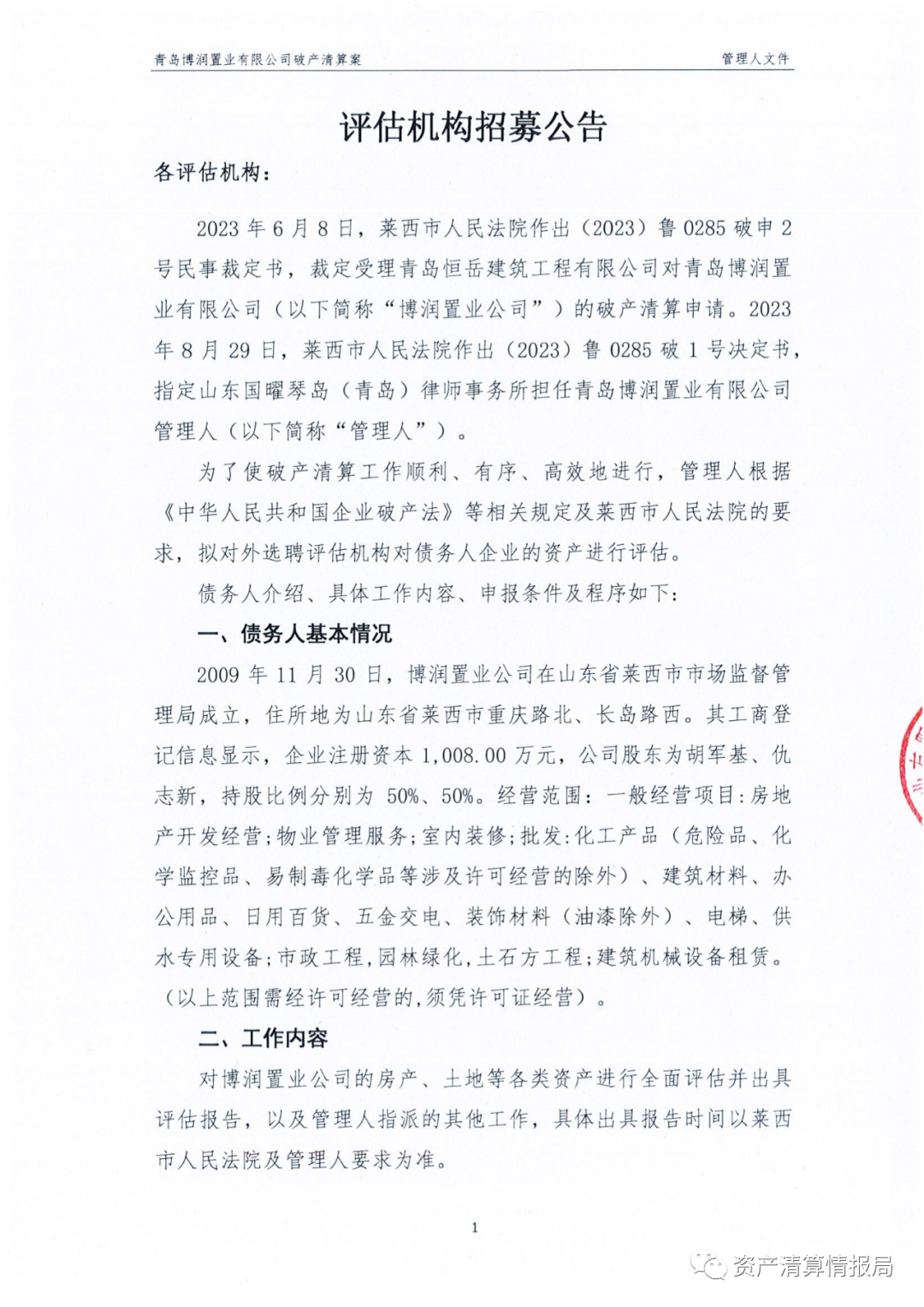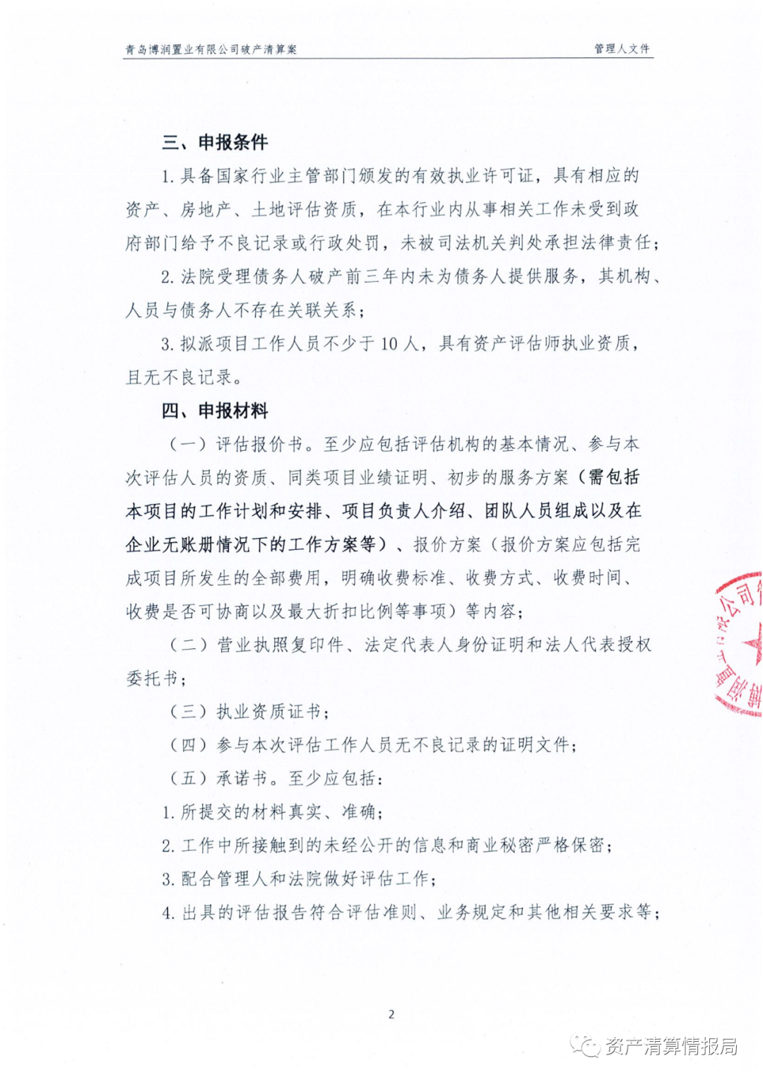 青岛博润置业有限公司破产清算案评估机构招募公告