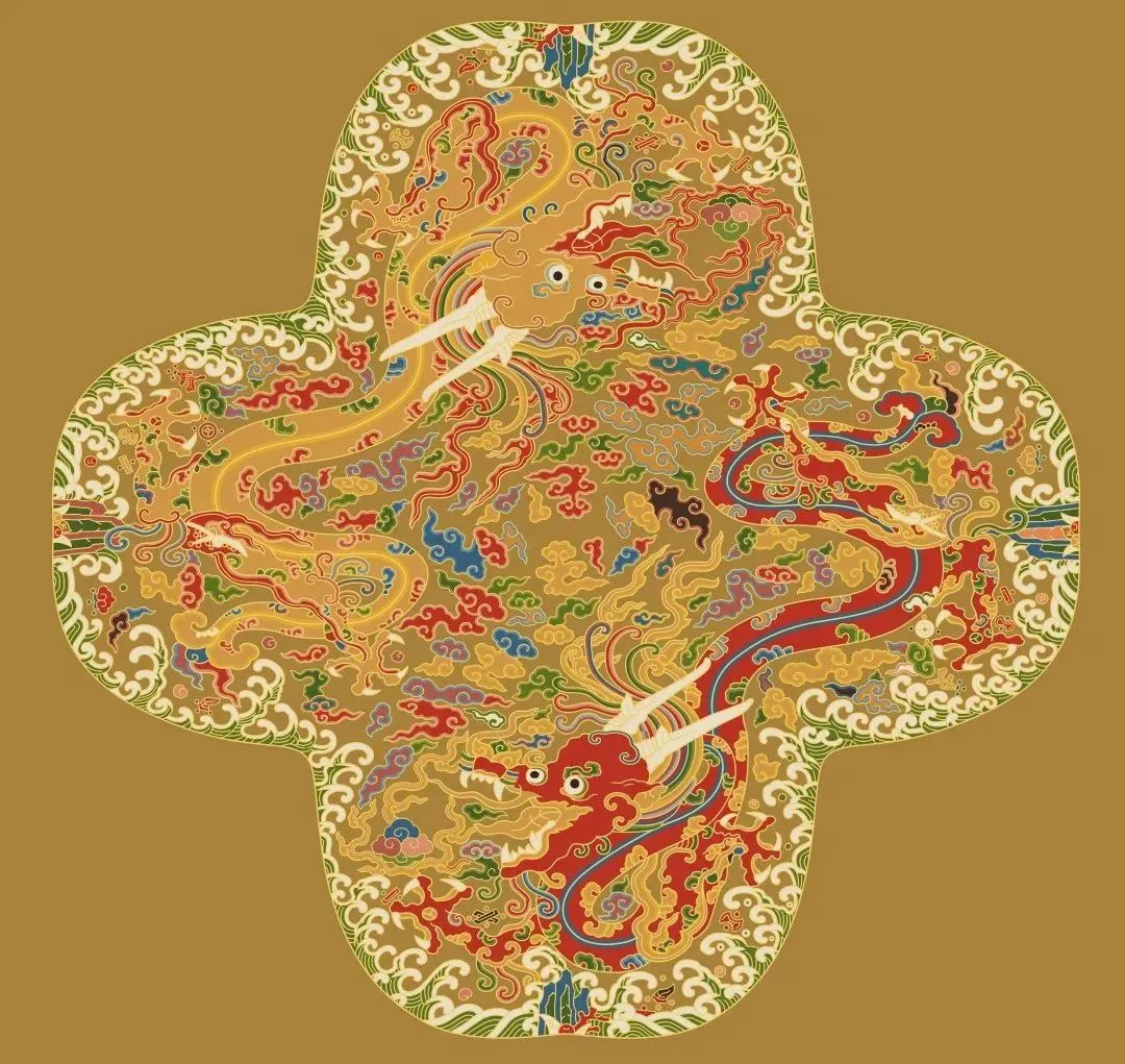 在孔府旧藏男装中,明香色麻飞鱼贴里和墨绿色妆花纱云肩通袖膝襕蟒袍,以及女装中香色芝麻纱过肩蟒长衫、大红色妆花纱飞鱼纹妆花纱长衫和大红色绣过肩麒麟鸾凤纹袍等服装纹样都采用了这种布局方式。在这些服饰上,威风凛凛的蟒、飞鱼、斗牛或麒麟常两两首尾相接,并饰以海水、江崖、杂宝、彩云等辅纹,气韵生动,活泼流畅。