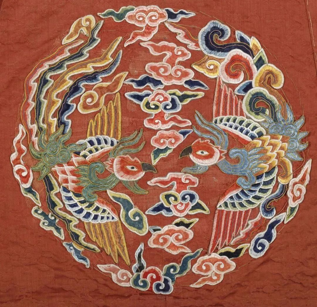 在明代主题纹样中,代表吉祥美满的圆形纹样应用比较广泛。如孔府旧藏赭红色暗花缎缀绣鸾凤圆补女袍,圆领,大襟右衽,宽袖收口,左右开衩并纳褶,下摆前短后长,前胸、后背处各缀一圆形补子。补子上的图案为左凤右鸾。