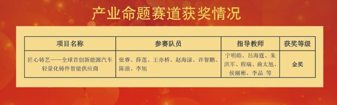 学校深入推进产教融合、科教融汇,依托省重点实验室平台,与大连亚明汽车部件股份有限公司对接的产业命题赛道项目《匠心铸艺——全球首创新能源汽车轻量化铸件智能供应商》首获金奖,实现了我校在此赛道金奖从无到有的重大突破,充分体现了校企合作协同育人成效。