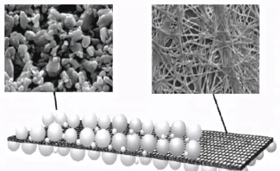 E S CHOI等将一种耐热性较好的PET无纺薄膜两侧浸涂陶瓷粒子,发现较传统PE膜的导电率提高50%。日本日立麦克赛尔公司则将板状无机颗粒涂覆在基膜表面,可在高温下保持形状的完整性。德国德固赛公司将与Al2O3、SiO2颗粒均匀混合的硅胶溶液涂覆在无纺布基布上制备了Separion隔膜,其结构如图3所示。
