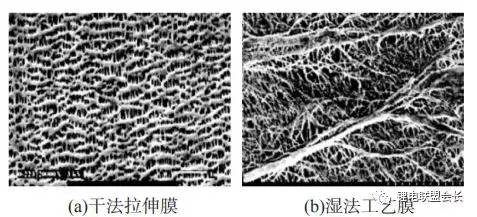 高性能锂离子电池要隔膜具有厚度均匀性以及优良的力学性能(包括拉伸强度和抗穿刺强度)、透气性能、理化性能(包括润湿性、化学稳定性、热稳定性、安全性)。据了解,隔膜的优异与否直接影响锂离子电池的容量、循环能力以及安全性能等特性,性能优异的隔膜对提高电池的综合性能具有重要的用途。锂离子电池隔膜具有的诸多特性以及其性能指标的难以兼顾决定了其生产工艺技术壁垒高、研发难大。隔膜生产工艺包括原材料配方和快速配方调整、微孔制备技术、成套设备自主设计等诸多工艺。其中,微孔制备技术是锂离子电池隔膜制备工艺的核心,根据微孔成孔机理的差别可以将隔膜工艺分为干法与湿法两种。传统锂离子电池隔膜为聚烯烃隔膜,多为单层或三层结构,如单层PE、单层PP、PP/PE/PP复合膜等。按照常规制备工艺可分为干法和湿法工艺。干法工艺是最常采用的方法,利用挤压、吹膜的方法,将熔融的聚烯烃树脂制成片状结晶薄膜,并通过单向拉伸或双向拉伸在高温下形成狭缝状多孔结构。单向拉伸工艺制备的薄膜微孔结构扁长且相互贯通,导通性好;生产过程中不使用溶剂,工艺环境友好;薄膜的纵向强度优于横向,且横向基本没有热收缩;代表公司主要有美国Celgard、日本UBE及国内的星源材质、沧州明珠和东航光电。双向拉伸工艺是中科院化学研究所开发的具有自主知识产权的工艺,通过在PP中加入具有成核作用的β晶型改进剂,利用PP不同相态间密度的差异,在拉伸过程中发生晶型转变形成微孔。双向拉伸工艺制备的薄膜纵横向均具有一定的强度,微孔尺寸及分布均匀。国内代表公司主要有新乡格瑞恩、新时科技、星源材质等。湿法工艺在工业上又称相分离法或热致相分离法,其制备原理是加热熔融在常温下互不相容的低分子量物质(液态烃、石蜡等)和高分子量物质(聚烯烃树脂)的混合物,使该混合物形成均匀混合的液态,并通过降温相分离压制得到微孔膜材料。湿法薄膜比干法薄膜的三维结构更加复杂,公众号动力电池BMS,微孔屈曲度更高(图2);但是湿法因生产过程使用溶剂而较干法相比在绿色环保方面相对欠缺优势,且热稳定性差,工艺流程也相对复杂。根据压制膜片时拉伸工艺的不同,可分为双向同步拉伸和双向异步拉伸,两种拉伸工艺的区别在于在压制成膜片时所进行的拉伸是否是纵横向同时进行。