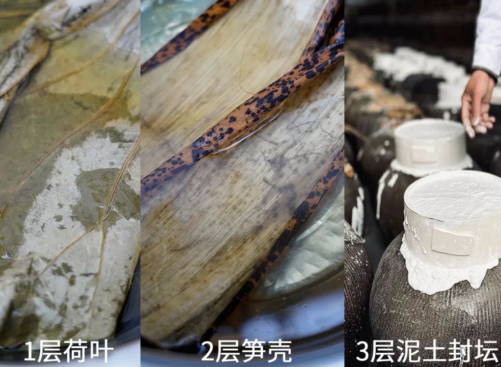 酿造工艺上,也用的古法,以徽州当地的非遗酿造工艺,1层荷叶、2层笋壳、3层泥土封坛,用天然植物酒曲、当季新米酿造而来。