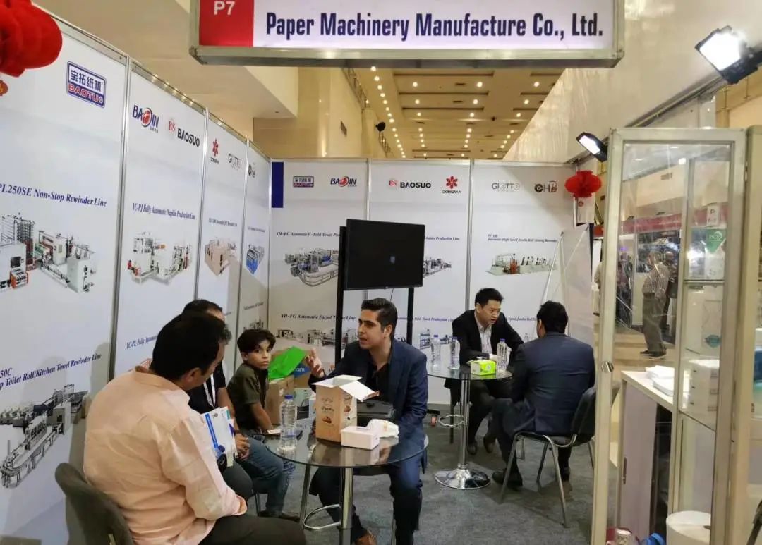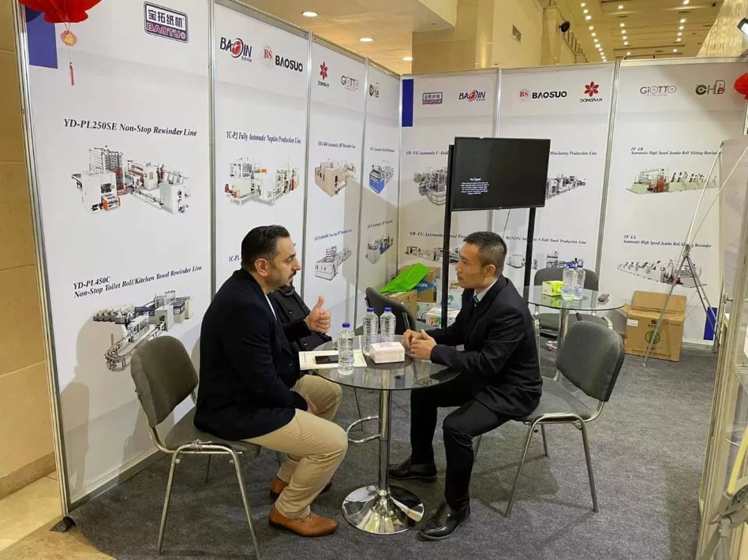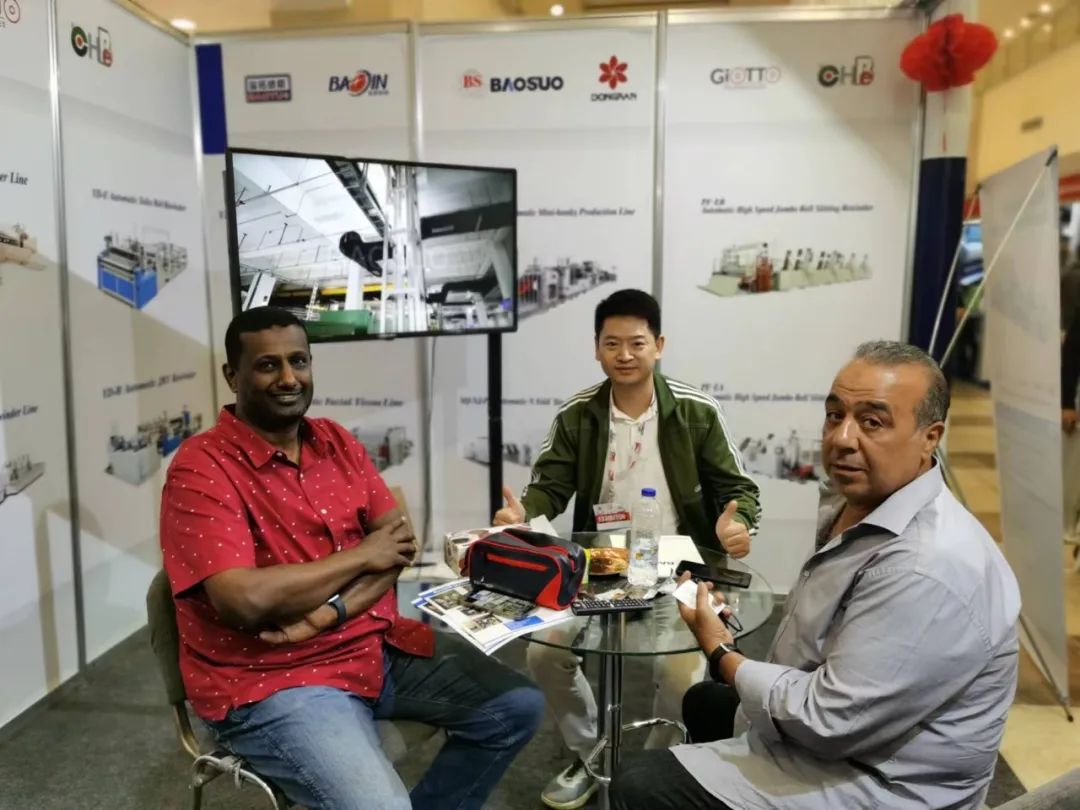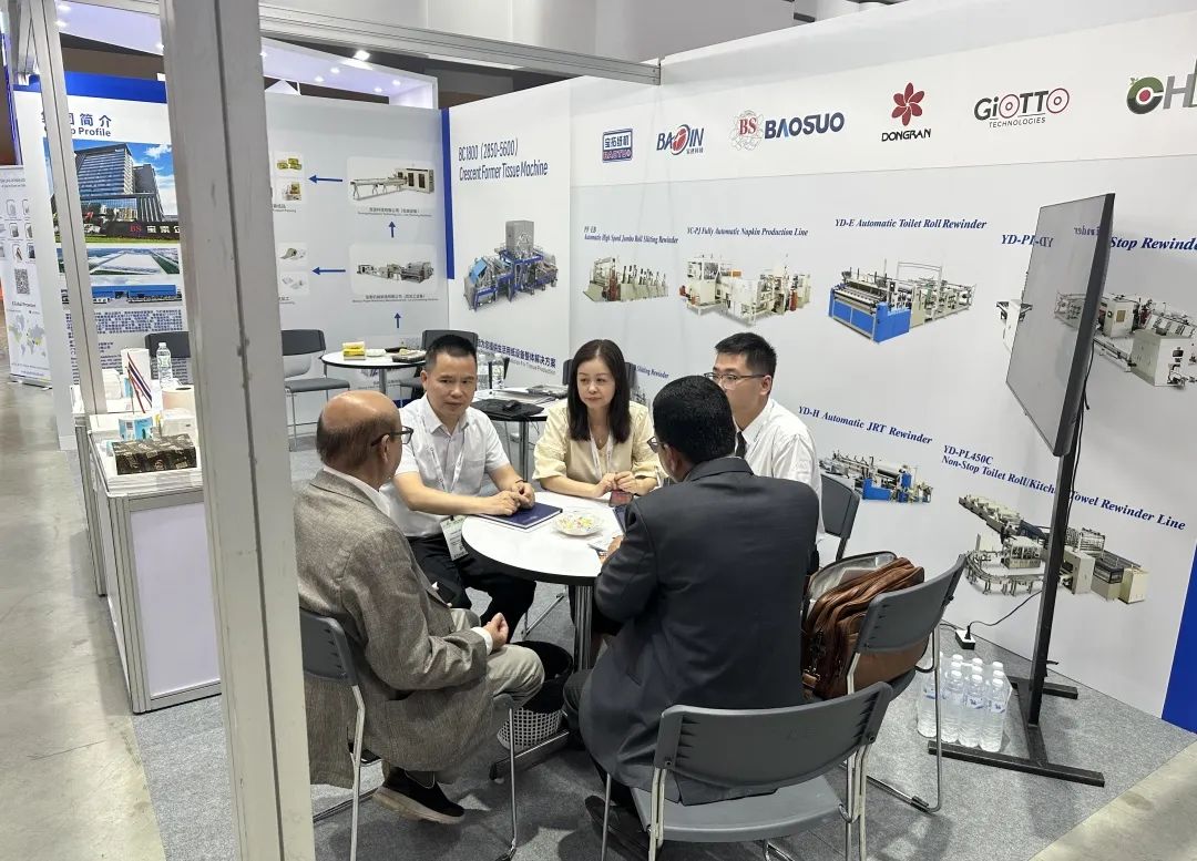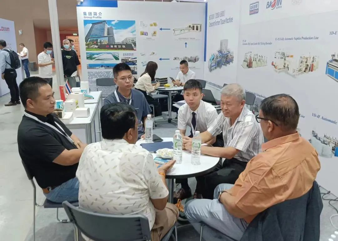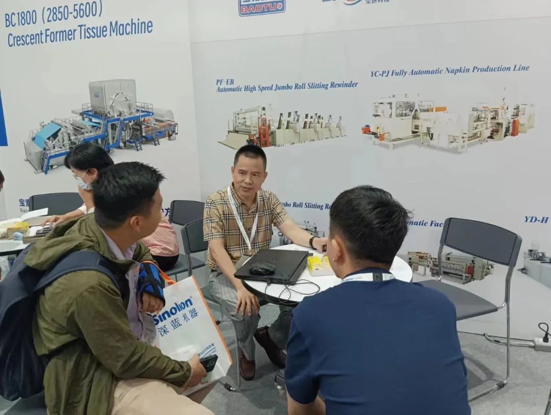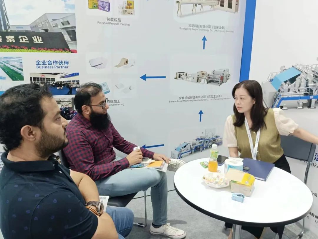参展过程中,宝索销售团队就产能优化、设备配套等一系列问题,耐心地给每一位到场的客户做详细解答,全方位呈现宝索企业集团生活用纸智能装备整体解决方案的设备优势。