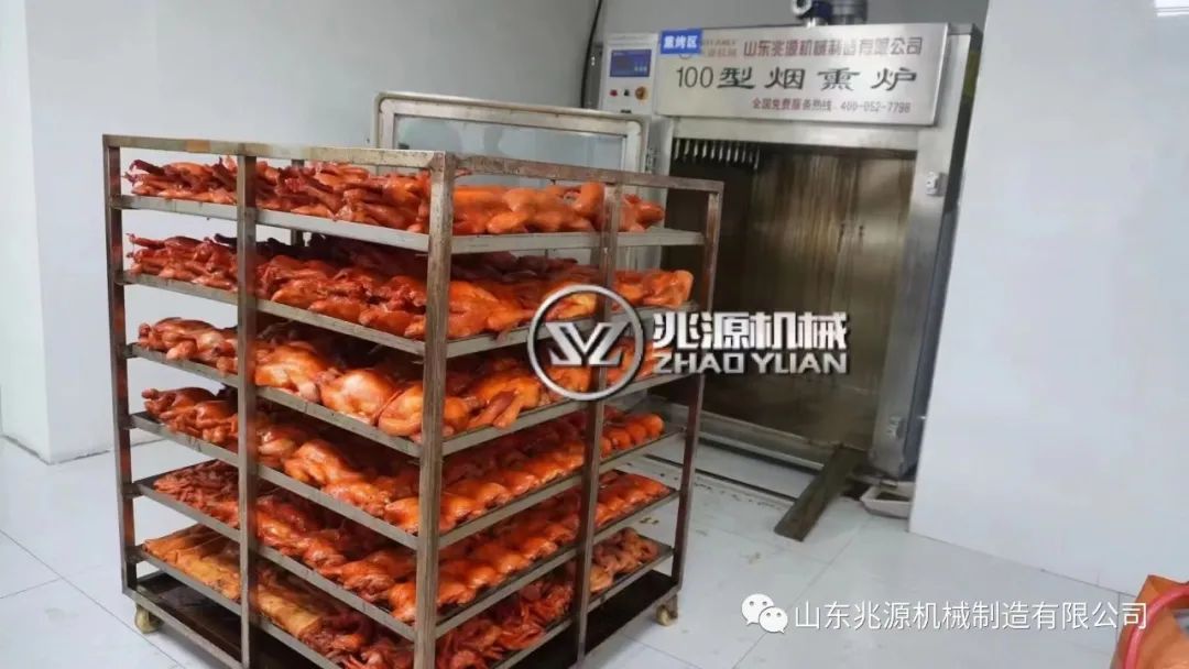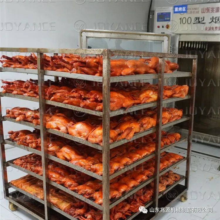 1.大型商用食品熏肉机封闭式操作不污染环境,不伤害操作人员,占地面积紧凑,排烟时间短。