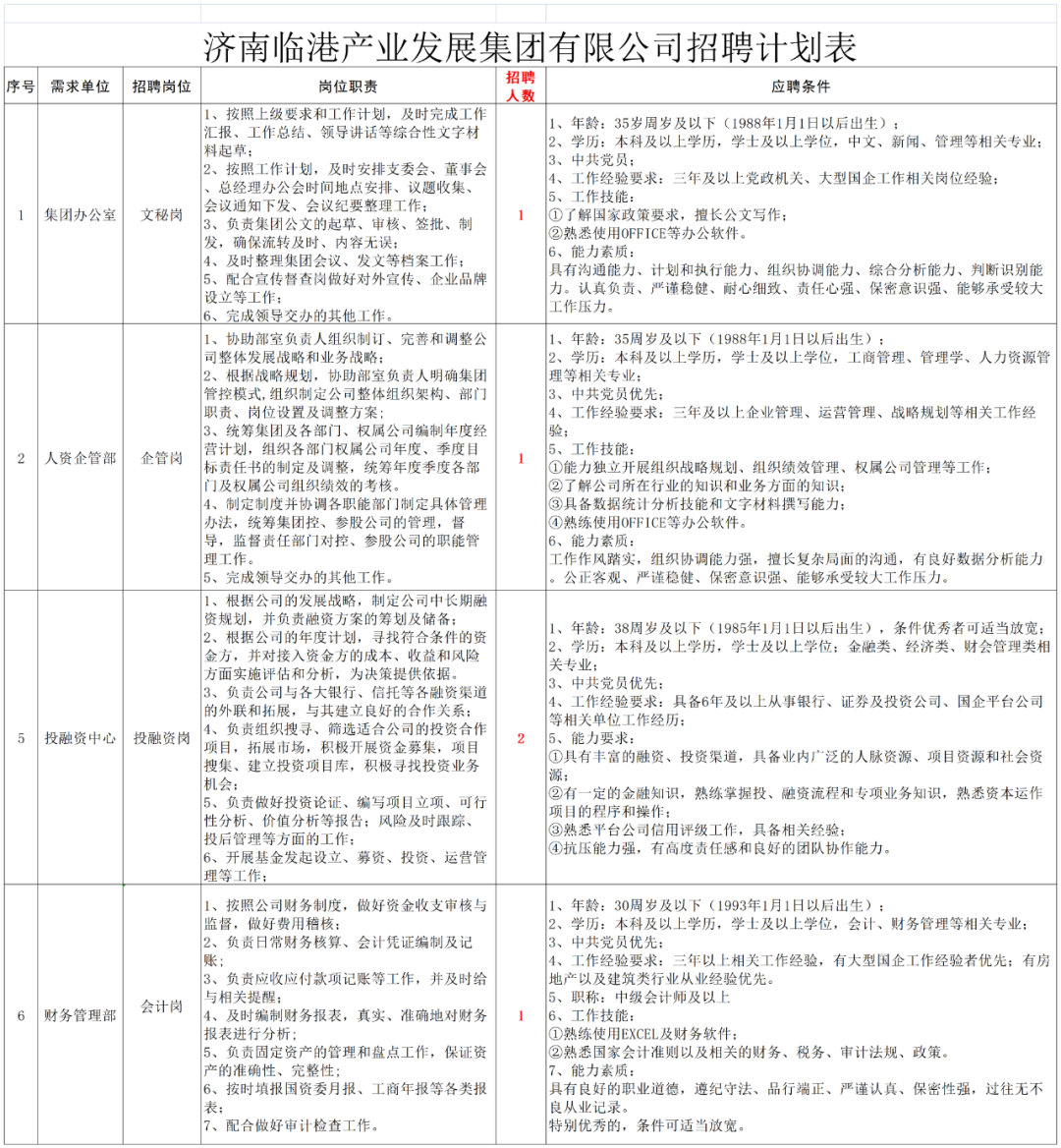 本次招聘主要面向社会招聘,共发布需求岗位4个,计划招聘5人,岗位工作地点均为济南市。具体岗位及要求详见 《济南临港产业发展集团有限公司招聘计划表》(附件)。