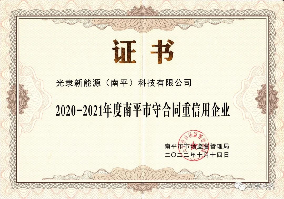 近日,光隶新能源(南平)科技有限公司获得由福建省南平市市场监督管理局颁发的”2020-2021年度南平市守合同重信用企业“的企业公示证书。