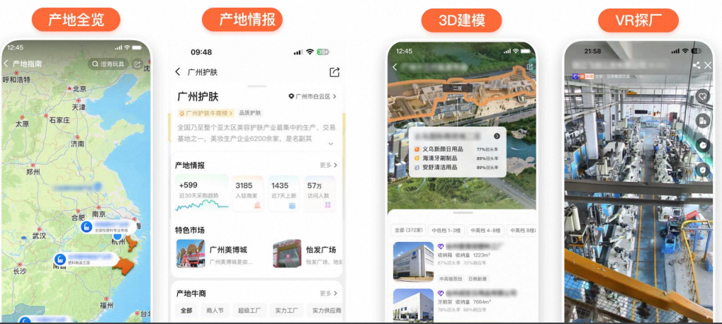 产业带、专业市场、工厂型商家、市场集散地均具有明确的地理方位属性,同时也是当前各类地图数据库相对缺失的地理信息资源。1688结合自身平台的产地生态资源,对国内上百个产业带进行信息数字化沉底,搭配高德地图POI技术呈现和检索方式,构建产业带地图。当前,该产地地图已沉淀国内200多个产业带信息,触达百万级产地厂商,同时具备国内最精细的产地商家检索资源,其颗粒度不仅包括产业带、产地等区域信息,也可渗透至市场、生产工厂、乃至销地档口。围绕区域产地,产地地图可推荐“产地牛商”,甚至对市场的楼层情况进行展示。例如,针对广州十三行的批发市场,会明确显示该市场共有372家商户,其中1-3楼为中低档产品,4-8楼为中高档,8楼以上为高档品。 (二)依托3D建模与VR探厂,实现云逛场地新体验