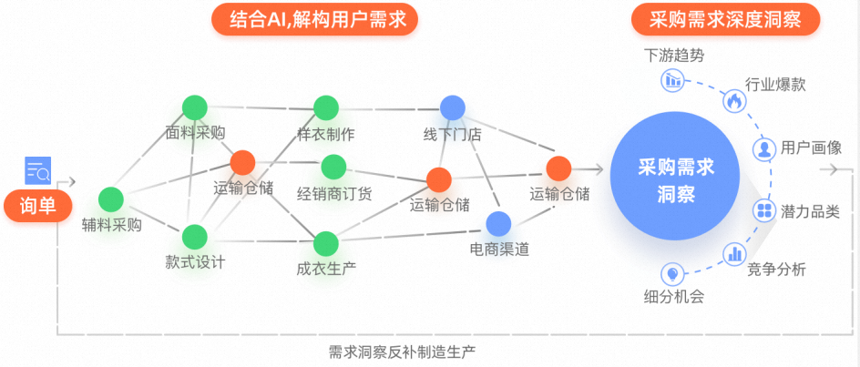 1688产业带地图的另一核心应用,在于其将地图搜索场景与传统电商的货品销售场景进行融合,从而实现两类工具的高效切换,真正地将产业带地图的地理区位属性与产地商家的产品属性联合表达,通过产地地图赋能产地商家的市场拓展。通过产业带地图检索商家后,即可进入商户的产品界面。界面不仅会展示工厂所生产的产品款式、产品售价,还会显示是否支持“小单定制”、“印图印文” 、“贴牌”、“包装定制”等生产型服务功能。同时,界面还打通商家旺旺系统,卖家与买家双方可直接进行在线交互,促进工厂和买家的货品询盘和在线撮合,提高商机获取买家的询盘机会。(五)基于产地情报和AI算法,提供智能化生意解决方案