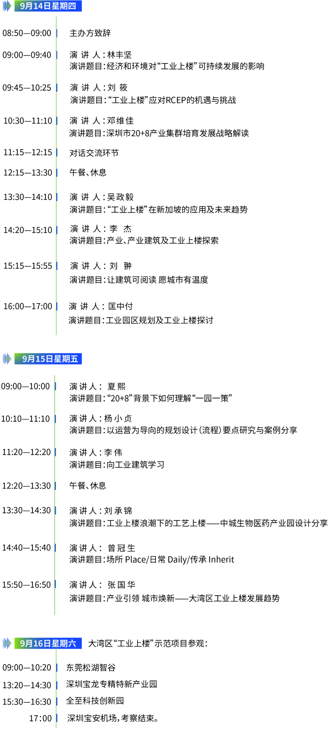 为了交流和学习大湾区“工业上楼”经验,探讨未来产业空间趋势,促进跨行业交流与合作,由北京中外友联建筑文化交流中心主办的【2023大湾区“工业上楼”产业空间规划设计与开发运营研讨观摩会】,将于9月14-15日在深圳登喜路国际酒店召开。目前,本次会议已吸引130多位来自产业地产开发、运营及建筑设计企业的代表参加。本次会议将聚焦“工业上楼”政策体系创新要点、建筑空间与规划设计创新要点、定位与开发运营要点等多个维度,解析当前发展热点与难点,共议产业空间迭代升级路径。会议议程已全部确定,现对外公布如下: