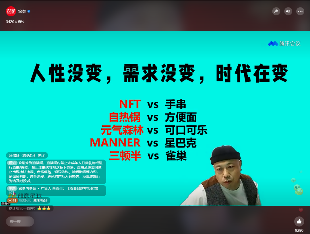最后,李春生就如何发动年轻人的力量表示,要保持品牌的年轻化,存量市场靠创新驱动,增量市场靠吸引青年群体。李春生还重点回答了直播间里观众提出的一些品牌方面的问题。他的解答结合具体行业案例,针对性强,为品牌经营者提供了可借鉴的经验。