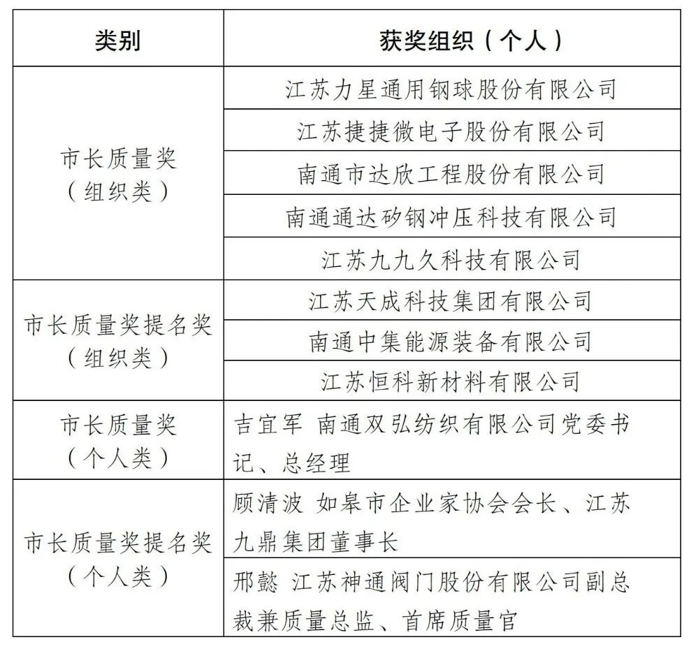 为深入贯彻落实《质量强国建设纲要》,更高水平推进质量强市建设,弘扬先进典型,树立质量标杆,助力经济社会高质量发展,根据《南通市市长质量奖管理办法》规定,经严格评审,市政府决定授予江苏力星通用钢球股份有限公司等5家企业“2022年度南通市市长质量奖(组织类)”,授予江苏天成科技集团有限公司等3家企业“2022年度南通市市长质量奖提名奖(组织类)”,授予吉宜军“2022年度南通市市长质量奖(个人类)”,授予顾清波、邢懿“2022年度南通市市长质量奖提名奖(个人类)”。