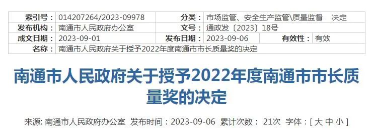《南通市人民政府关于授予2022年度南通市市长质量奖的决定》