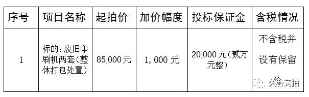 受某单位委托,我公司定于2023年9月11日9时30分起(延时除外),在中拍平台(https://paimai.caa123.org.cn/)进行标的:废旧印刷机两套(整体打包处置)。本场拍卖会标的采取同步拍增价式,价高者所得的原则进行拍卖。