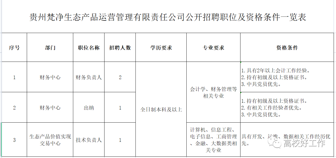 本次计划招聘专业技术人才4名。具体招聘职位及要求详见附件1《贵州梵净生态产品运营管理有限责任公司公开招聘职位及资格条件一览表》(以下简称“职位表”)。