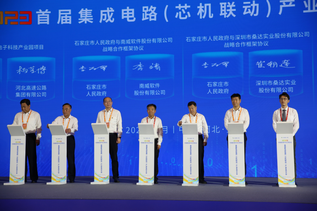 当天下午,南威软件集团董事长吴志雄、集团副总裁李靖受邀出席首届集成电路(芯机联动)产业生态大会。会上,李靖副总裁代表南威软件集团与石家庄市人民政府签署战略合作框架协议,吴志雄董事长见证签约,南威将与石家庄市共启数字新征程,助力石家庄市数字经济发展。