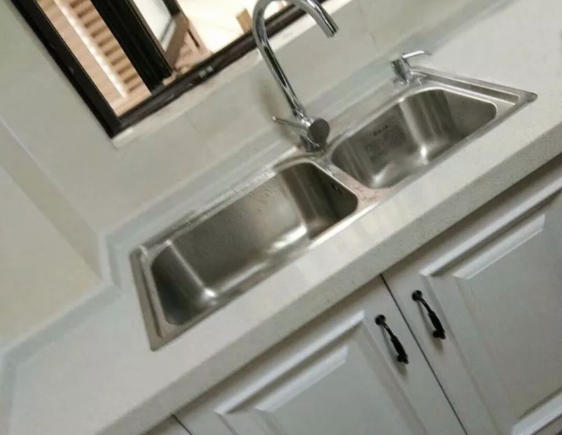 6、如果需要安装水槽等装置,首先应将石英石台面与台面上的档水进行一些局部的修整,并且进行敲击,检查是否悬空,对于一些微小的悬空,应在石材的下方打一些玻璃胶用来进行填充,对于一些严重的不平整性,则需要停止施工,对橱柜进行调整至平整状态。