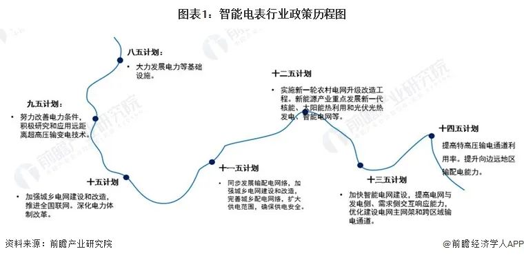 智能电表行业是我国电力信息化领域的重点行业。近年来,我国智能电表行业政策不断丰富,政策体系的不断完善推动行业规范化发展,进而提升行业整体的竞争力,引导行业内企业持续健康发展。从行业规划历程来看:“八五”时期,我国政策侧重点是大力发展电力基础设施;“九五”时期,提出了积极研究和应用输变电技术;“十五”、“十一五”和“十二五”时期,提出加强城乡电网建设和改造,深化电力体制改革;“十三五”和“十四五”时期,重点提到加快智能电网建设,提高电网与发电侧、需求侧交互响应能力等。