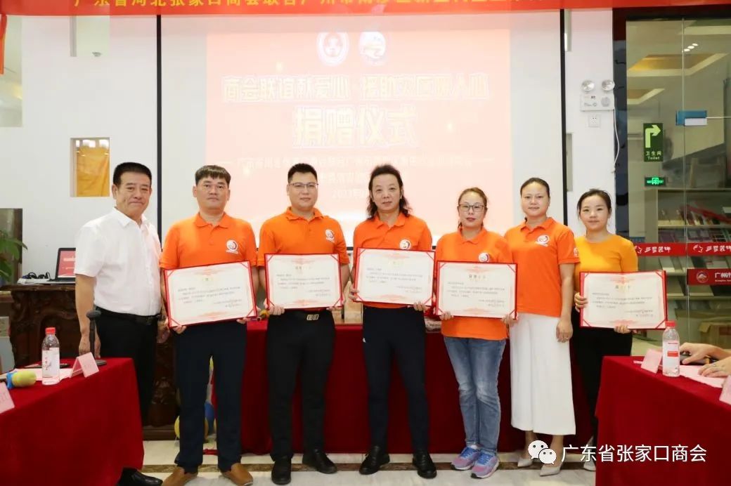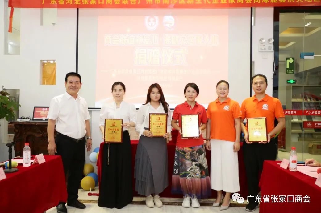在捐赠仪式上,涿鹿县代表刘延忠和刘以韧分别接受来自广东省张家口商会创会会长郝贵江及广州市南沙区新生代企业家商会会长管节生递交的转账到账支票,同时主持人邀请两家商会的执行会长上台一起见证这一重要的历史时刻!随后刘延忠代表涿鹿县大河南镇人民政府宣读感谢信并颁发捐款证书,同时制作了两面锦旗赠予两家商会以表谢忱。