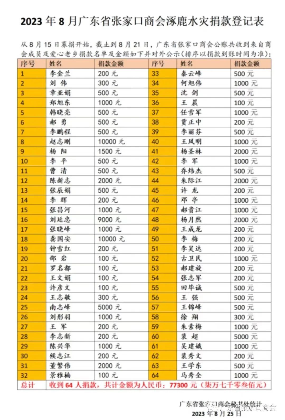 广东省张家口商会及爱心人士捐款77300元
