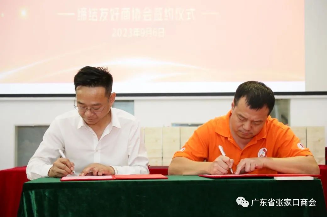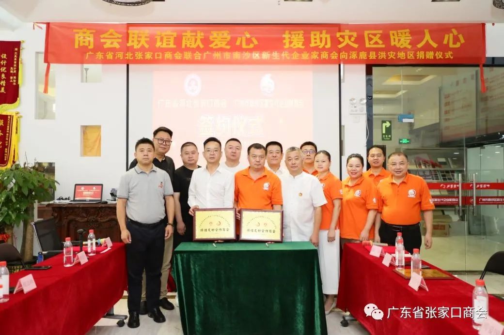 商会联谊献爱心 捐赠灾区暖人心!两家商会因为河北涿鹿洪灾发起的爱心捐赠走到一起并联合举办活动,通过这些天的交流对接,双方秘书长充分沟通互相学习,监事长和监事长、执行会长和执行会长、会长与会长的会晤,以及活动现场每一位参会者均做了自我介绍,大家一致认为双方商会的价值观、办会理念、脾气性格非常投缘,所以决定两家商会正式缔结友好商会!在双方领导班子的见证下广东省张家口商会郝贵江创会会长与广州市南沙区新生代企业家商会管节生会长现场签约了友好合作战略协议,并交换了友好商会牌匾。广东省张家口创会会长郝贵江在座谈共建环节说到:我们要相互学习借鉴两家商会的先进经验,提高办会水平;通过友好商会这个新平台,努力为双方会员之间的交流合作创造条件,不断开辟新的合作领域;希望通过这次交流座谈活动,增进友好商会之间的友谊,实现信息互通、优势互补、资源共享、共谋发展。