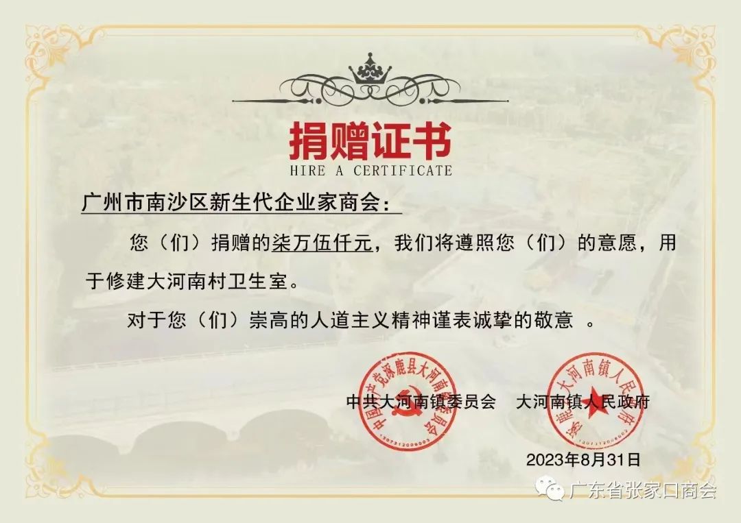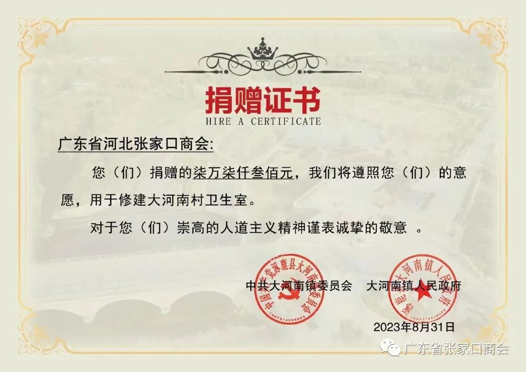天灾无情,人间有爱!心系家乡,慷慨解囊!在得知家乡涿鹿县发生特大洪灾,广东省张家口商会赵志刚会长第一时间和商会领导班子商议支援救援方案,并号召全体会员及在粤张家口籍老乡发起抗洪救灾募捐倡议书,同时涿鹿籍刘延忠监事长也积极响应,并向他荣任常务副会长的广州市南沙区新生代企业家商会发起为涿鹿洪灾地区募捐倡议书,涓涓细流汇成河,拳拳爱心暖人间,从8月15日募捐开始,商会会员及爱心乡贤积极参与,慷慨解囊,截止到8月21日,广东省河北张家口商会为涿鹿灾区募得善款共计77300元,广州市南沙区新生代企业家商会为涿鹿灾区募得善款共计75000元,两家商会共募善款152300元已汇至涿鹿县大河南镇人民政府账户,该捐款将定向用于涿鹿县大河南村社区卫生医疗站的灾后修建。