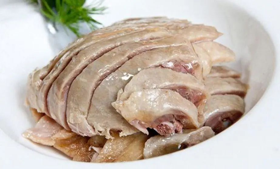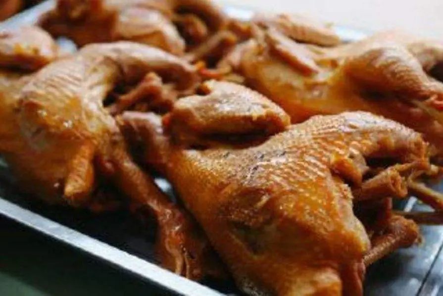 (6)在煮制过程中,火候的控制对盐水鸭的鲜嫩口味可以说相当重要,这是制作盐水鸭好坏的关键,水温始终维持在85℃左右,否则水开会导致肉中脂肪熔化,肉质变老,失去鲜嫩特色。