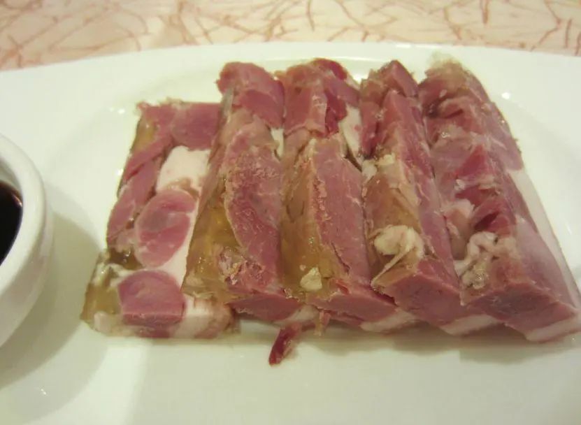 镇江肴肉是江苏省镇江市的著名传统食品,历史悠久,全国闻名。肴肉肉红皮白,光滑晶莹,卤冻透明,犹如水晶,故有“水晶肴蹄”之称,具有香、酥、鲜、嫩四大特点。瘦肉香酥,肥肉不腻,切片成形,结构细密,食时佐以姜丝和镇江香醋,更是别有风味。